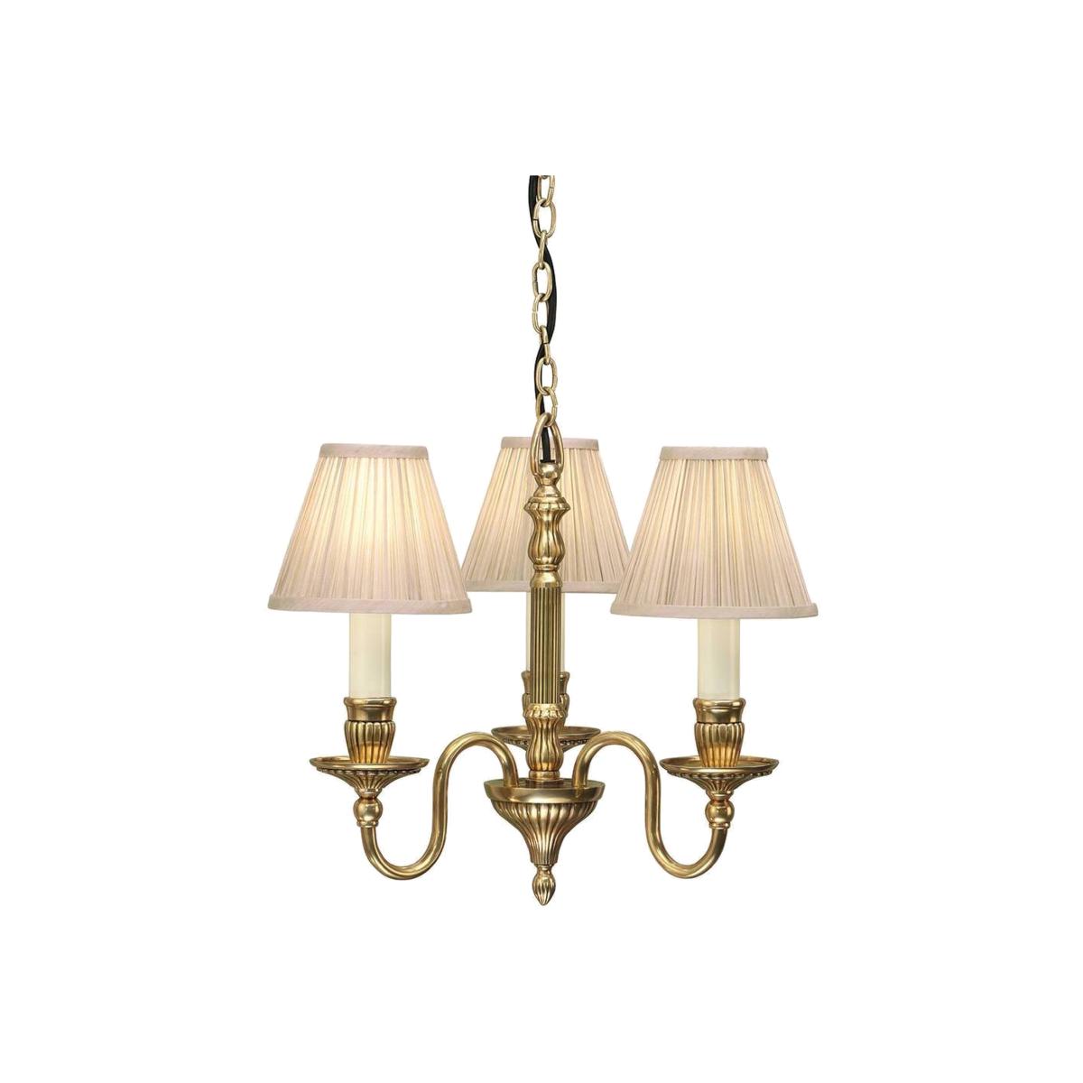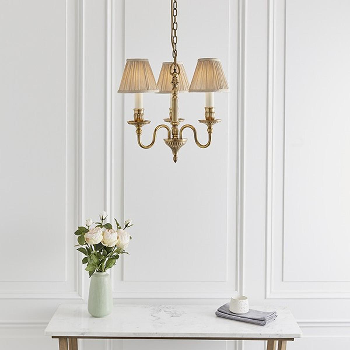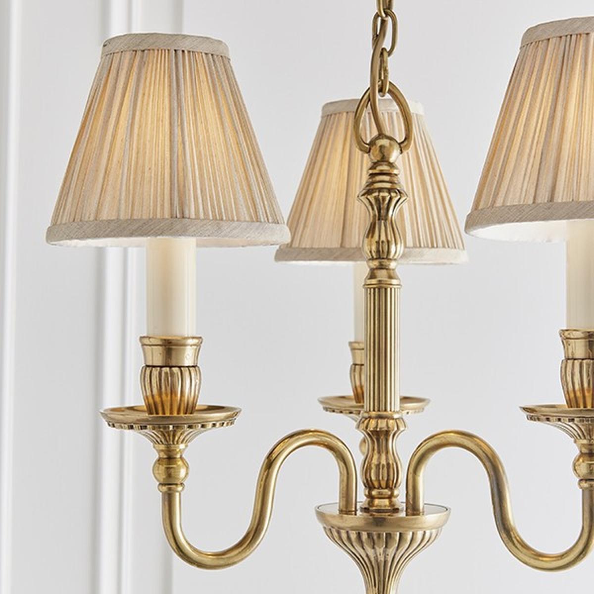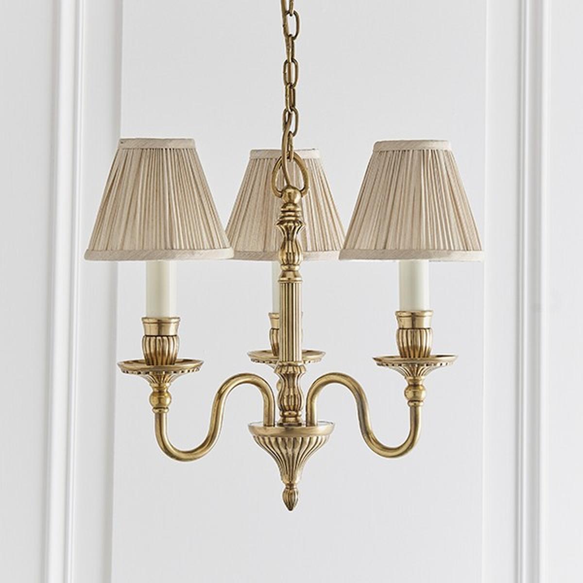 The Fitzroy three light is a premium quality, solid brass fitting in a Georgian style with a decorative detailed finish. Comes with pleated, beige organza effect shades. Matching items available.