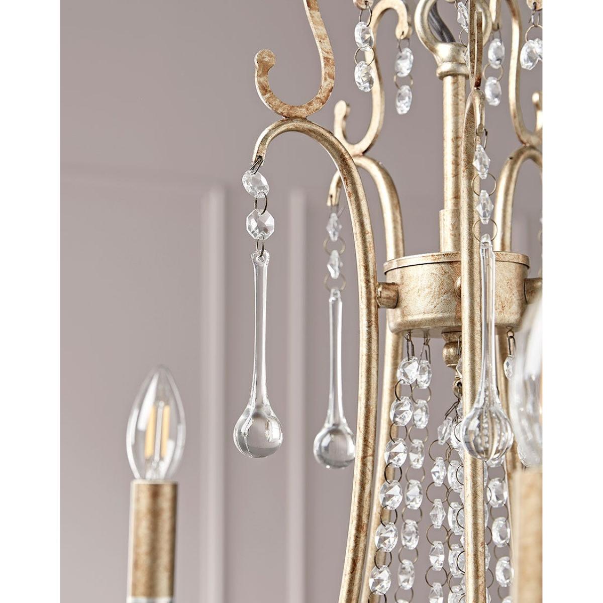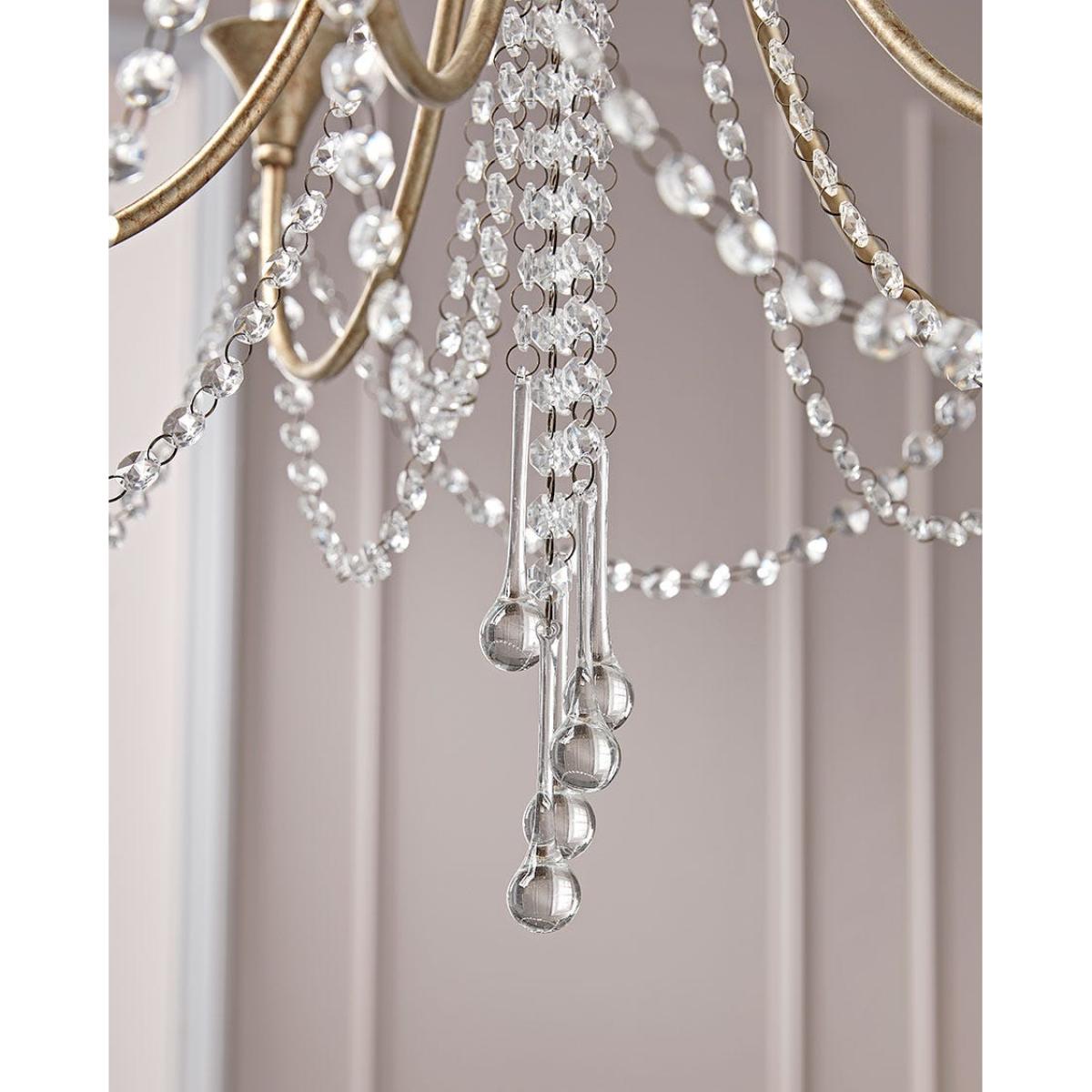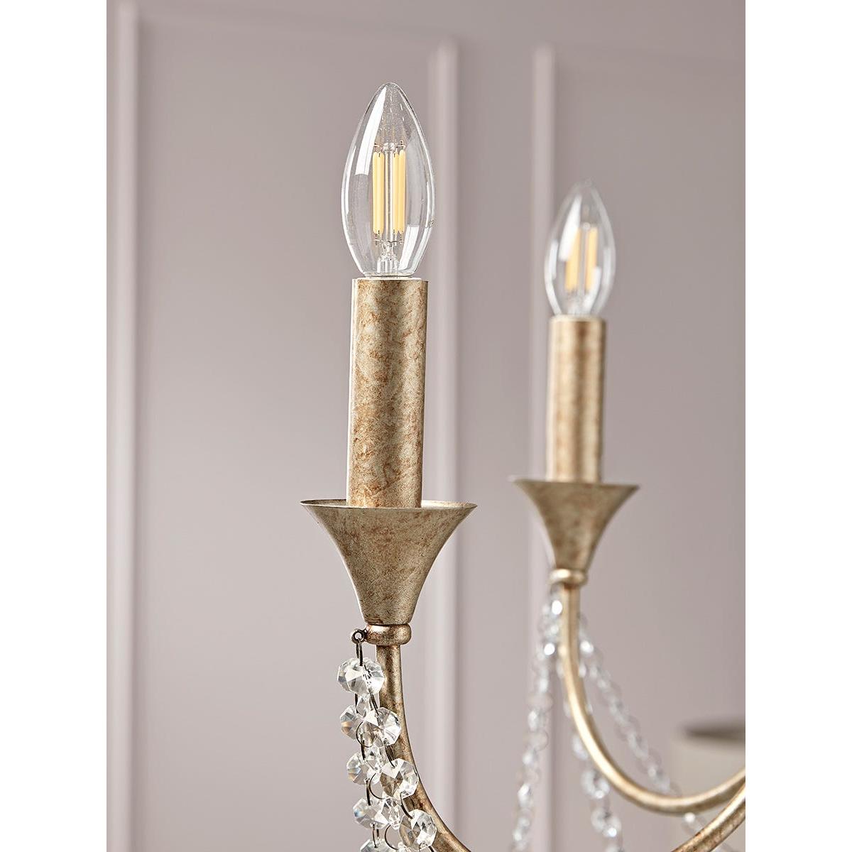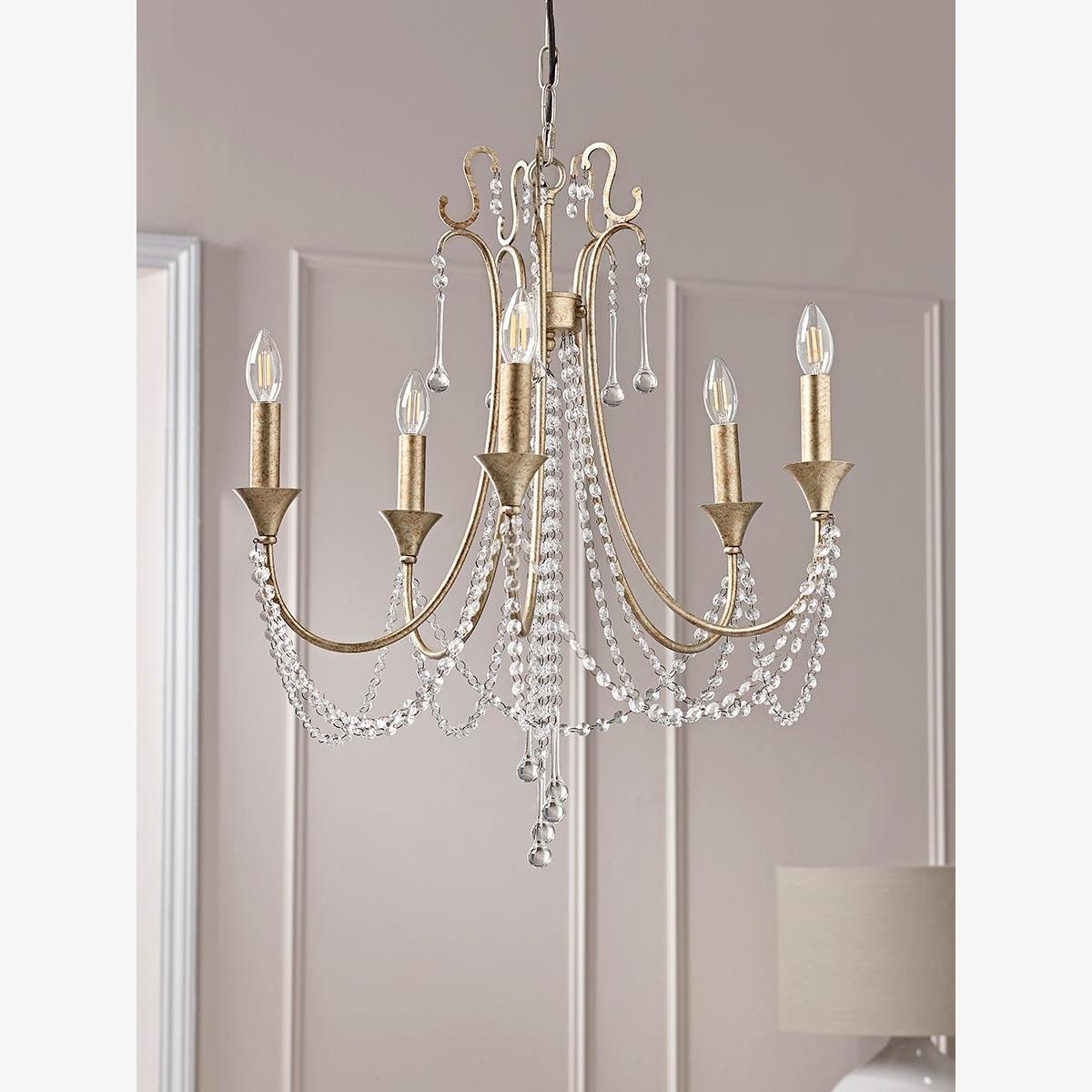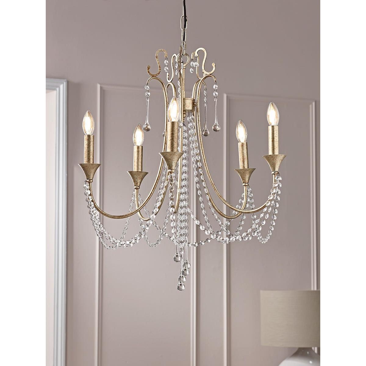 Full of romance, our vintage-inspired chandelier will make a pretty statement in your living room or bedroom. The five armed metal branches have the softest silver gold tones which, paired with strings of glass gems and tear shaped droplets that shimmer, creates the most opulent effect, day and night. Discover how to create the perfect lighting scheme for your home using our Lighting Buying Guide.
