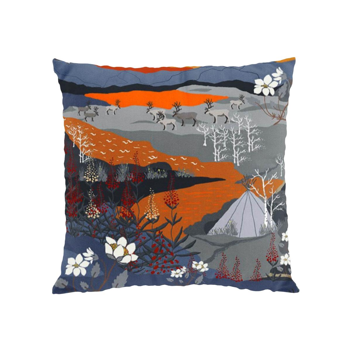 Fjällvandring cushion cover 47x47 cm from Arvidssons Textil has a beautiful mountain-inspired pattern that is printed on 100% cotton. It would do nicely on a stool in the hall, for instance, or on the sofa in the sitting room. The pattern with mountains, reindeer and flowers is designed by Louise Videlyck.