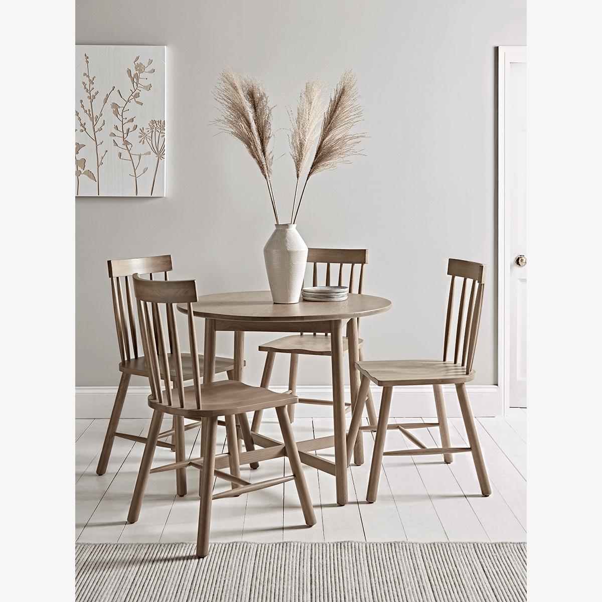 Please accept our apologies, this was a much loved item, and is sold out until next Autumn!With an elegantly simple profile, our Scandinavian inspired dining table features a tactile, smooth oak surface and feature cross framed legs. Crafted from oak with a greywash effect and flawlessly finished, our stylish dining table has a subtle wood grain and tactile, smooth edges. Set a relaxed look in your entertaining space with a piece that instantly sets a pared back tone - the round form makes for a social arrangement and will comfortably seat four. To complete the look pair with our Fjord Dining Chairs.