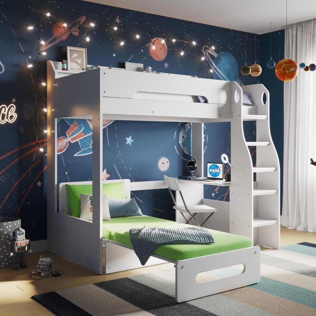 The Flair Cosmic High Sleeper is a fantastic choice for modern, playful interiors, especially in kids’ rooms that need to maximise space. I love its sleek white finish, which makes it versatile enough to work in both contemporary and minimalist settings, while the space beneath can be styled as a cosy reading nook, desk area, or even for storage. It’s practical and fun, perfect for creating a multi-use space without clutter. To style it effectively, I recommend adding colourful bedding and some themed decor to enhance the cosmic vibe, and keeping accessories like fairy lights or floating shelves nearby for practical storage and visual interest. This piece is especially great in rooms where space efficiency and youthful energy are key, making it both functional and visually appealing.