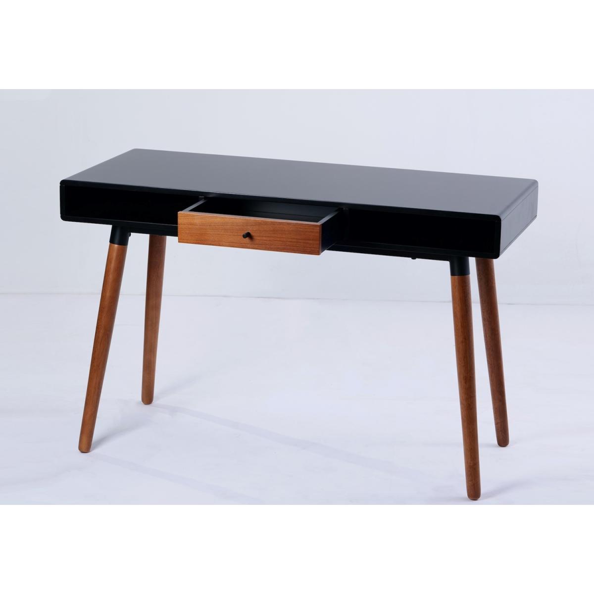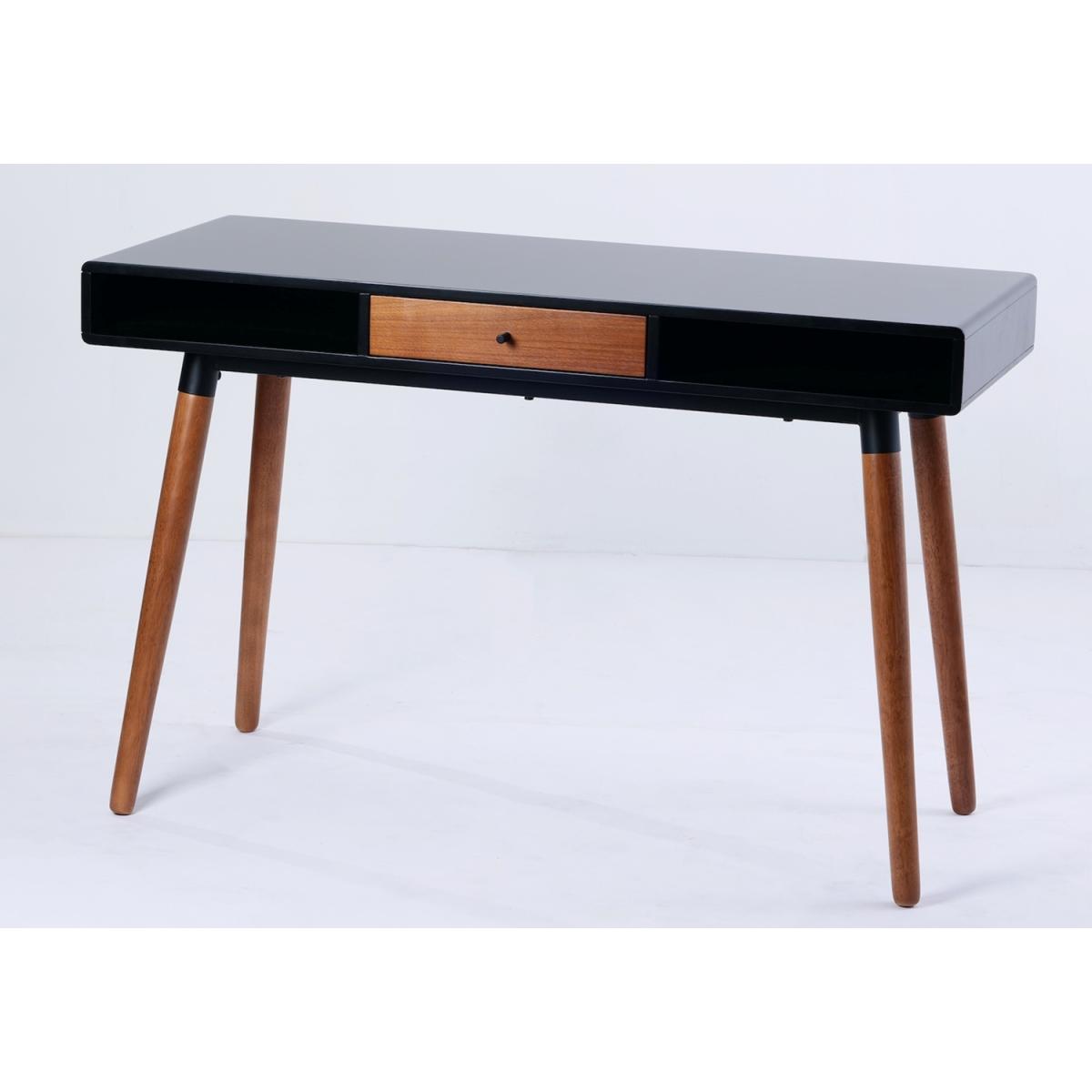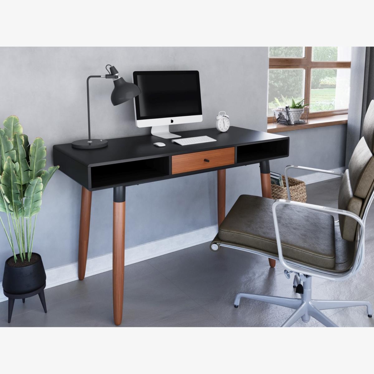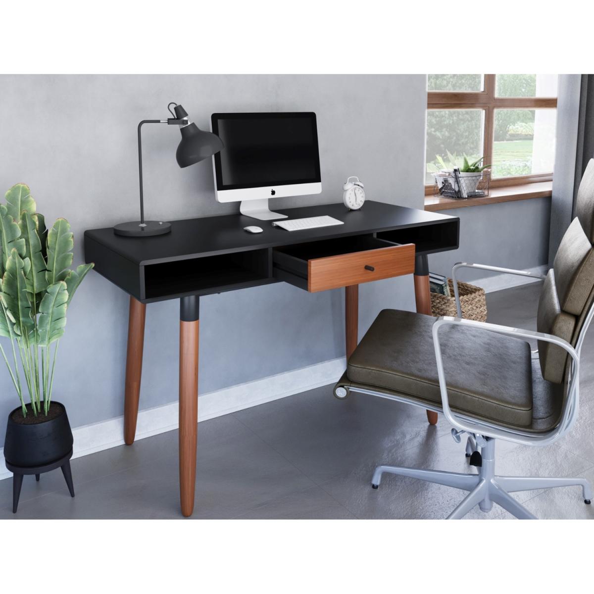 I love this desk for its versatile blend of walnut warmth and black accents, making it a stylish yet functional addition to various interiors. It works particularly well in mid-century modern or Scandinavian-inspired schemes, thanks to its clean lines and natural wood tones. Practical styling tips include pairing it with minimalist accessories to keep the space uncluttered, or adding a statement lamp and a few organisers for a functional workspace. Its size is ideal for smaller home offices or as a sleek writing desk in a blend of contemporary and vintage environments.