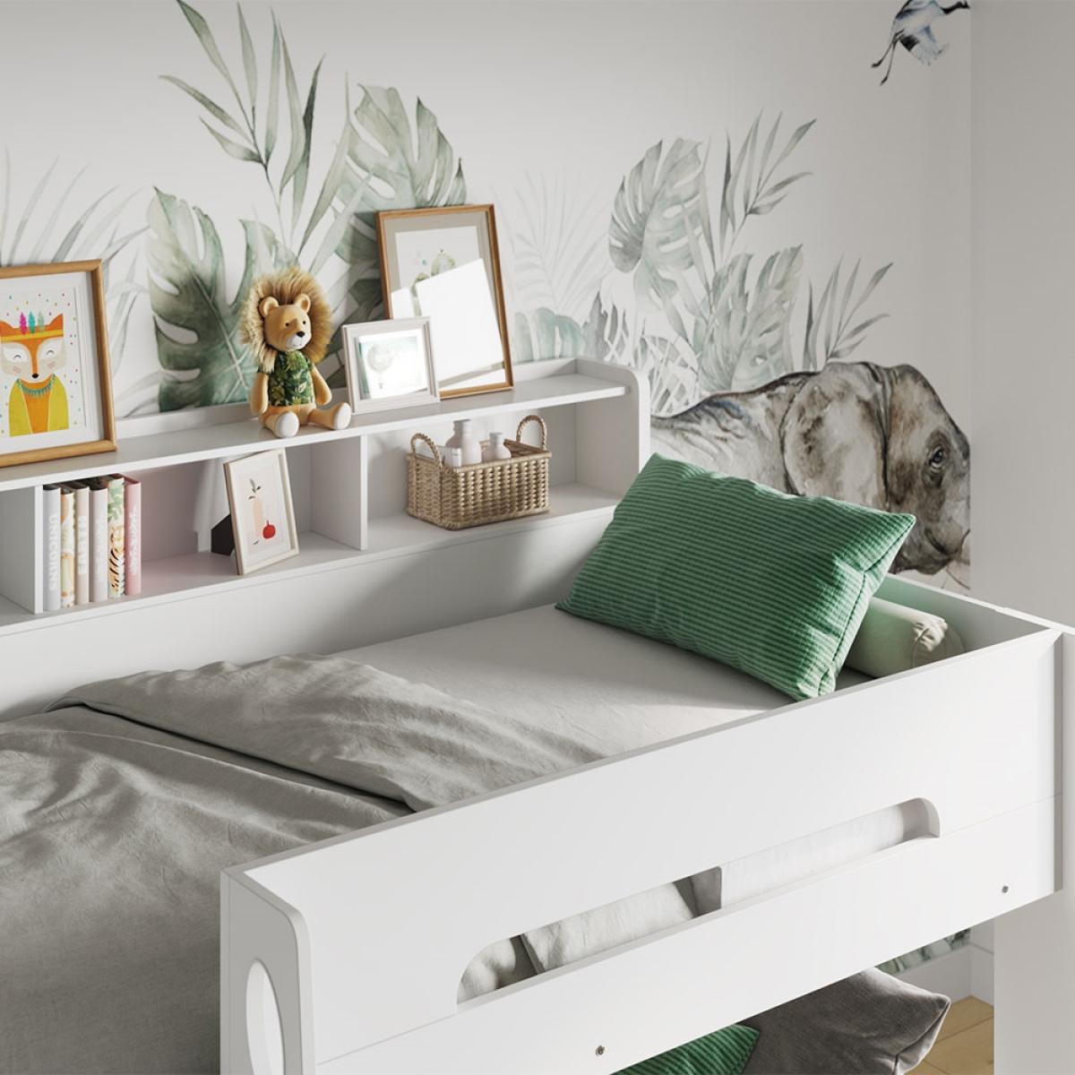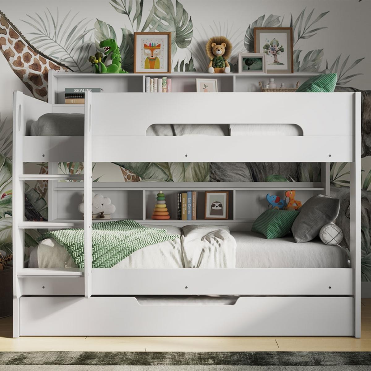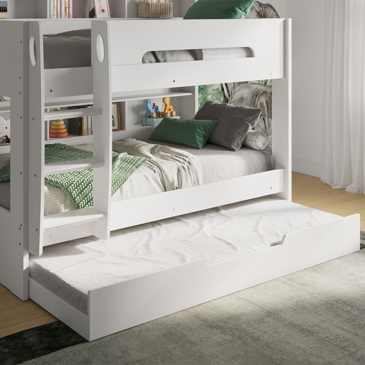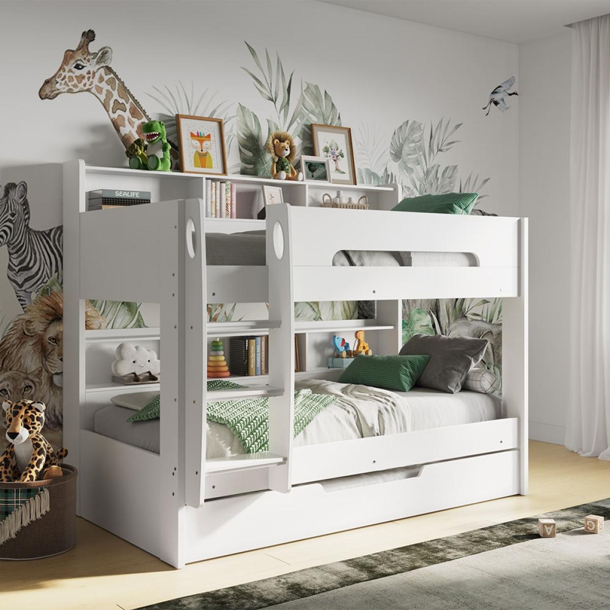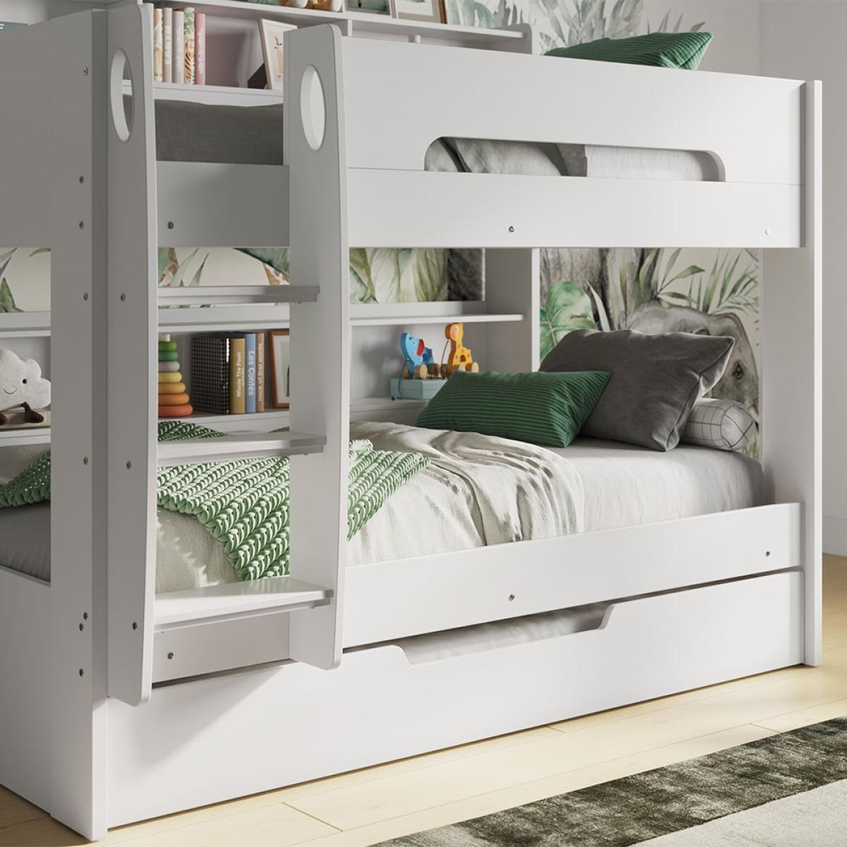 A bunk bed and a bookcase! The Flair Furnishings Interstellar White Bunk Bed with Trundle Drawer & Shelving makes bedroom sharing better! Each bunk has it's own bookcase and shelves, ready for favourite stories, toys, bedtime drinks and nightlights. Split into 3 sections, kids will love personalising their shelves and sleep space. Choose the ladder orientation to suit their bedroom and make the best use of their room. Style the neutral white frame with their choice of bedding, removable decals and decorative lights to cosy it up! A great choice at home or at the Grandparent's, this brilliant bed can fit up to 3 kiddywinks with the trundle drawer! Or simply use as extra storage!.
