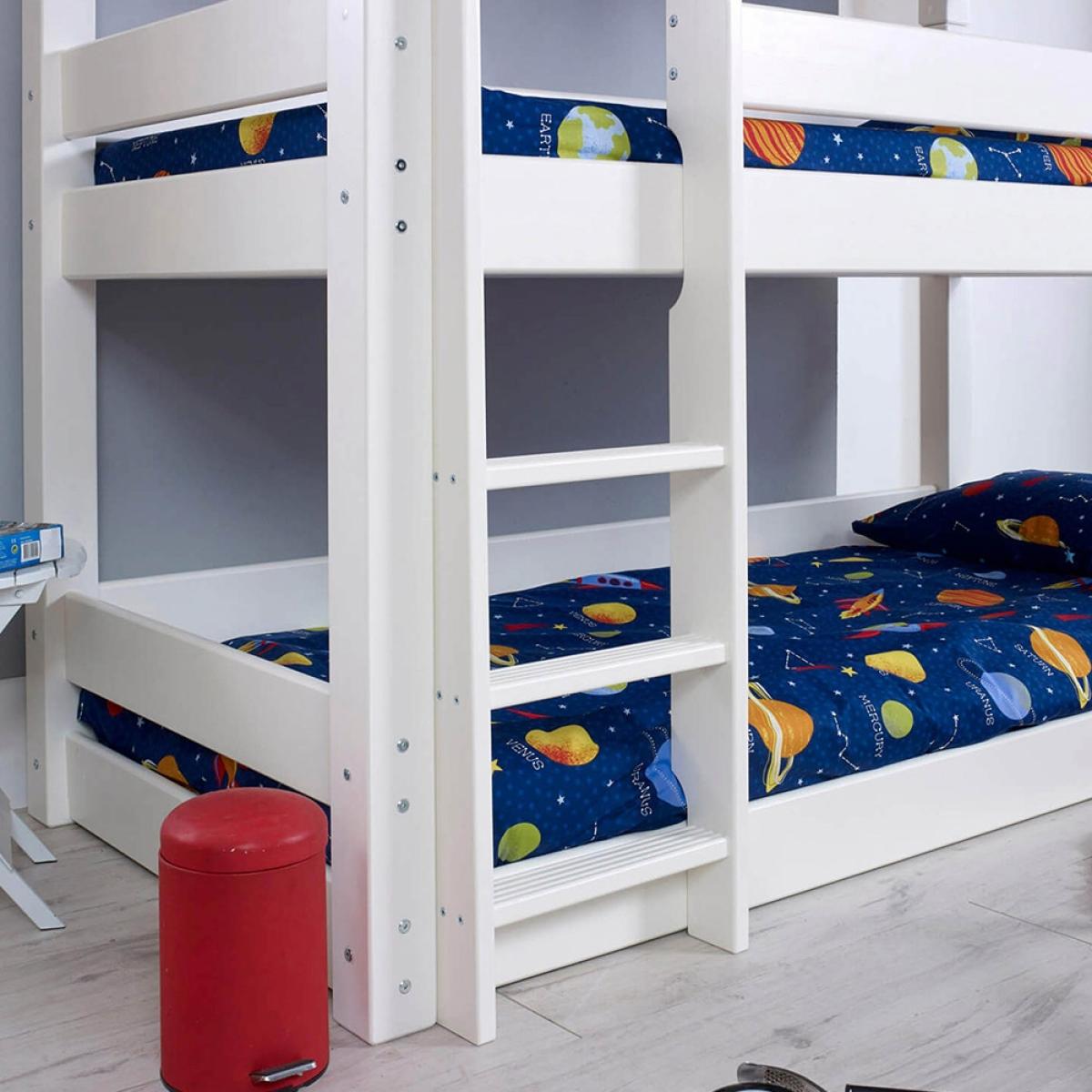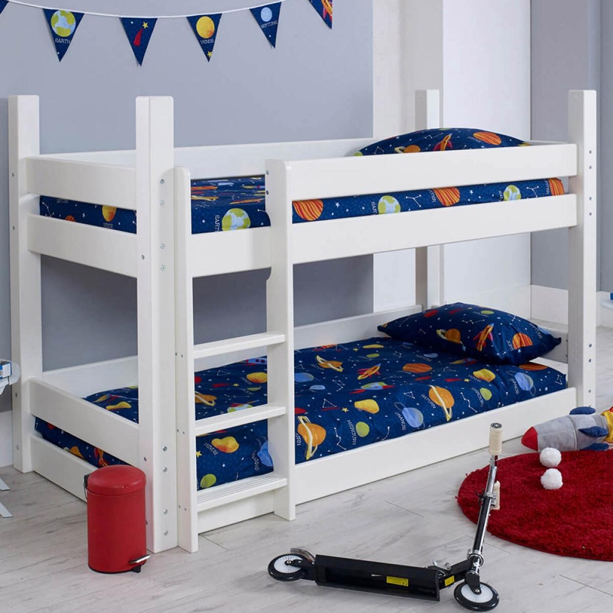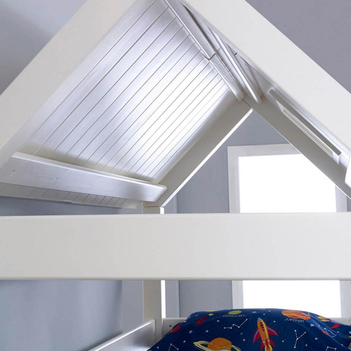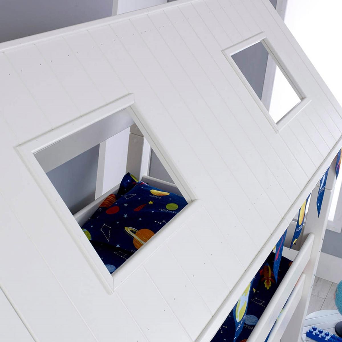 You'll have no trouble getting your kiddies into bed with the knowledge that the fantastical Flair Furnishings Scandinavia House Bunk Bed is waiting for them. With its gorgeous sloped roof and cut out windows, your kiddies imagination can run wild. Are they in a top-secret fort fighting off baddies or maybe in a cabin in the middle of a forest on the search for mystical animals, the possibilities are endless! With its simple white finish, the bed will fit into a whole host of themed rooms, why not add some colourful bunting to make it truly unique. Not only does the bed look great but it's practical too! The bottom bunk is low to the floor, so perfect for little ones to get in and out of bed without any risk of bumps!.
