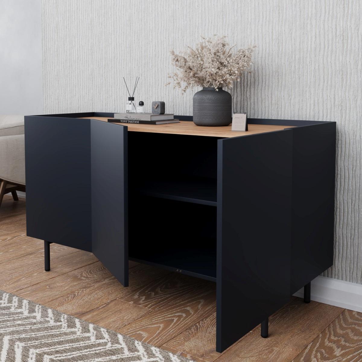This contemporary sideboard boasts a fabulous retro vibe, combining style and functionality. Its sleek design with flat panelled doors and a sunken oak veneer top offers a natural yet modern aesthetic.