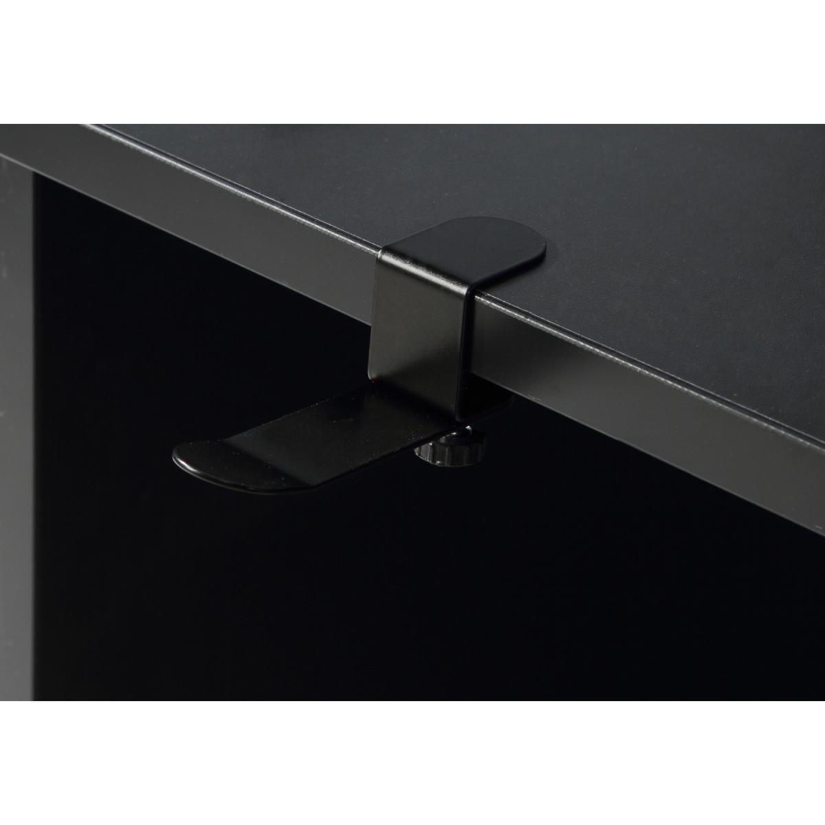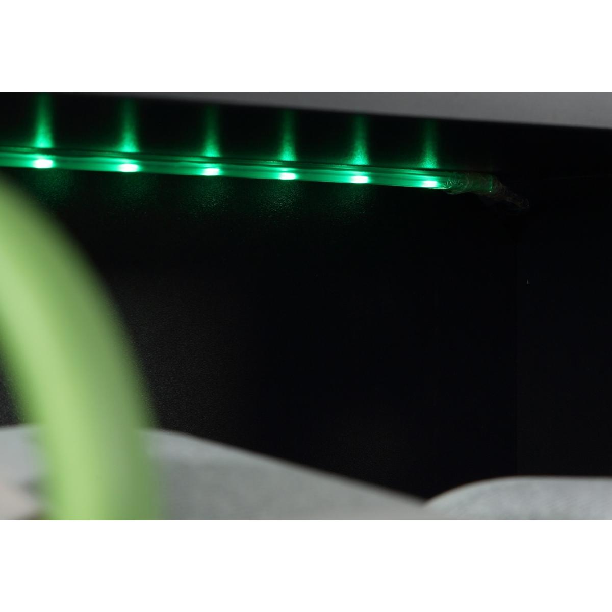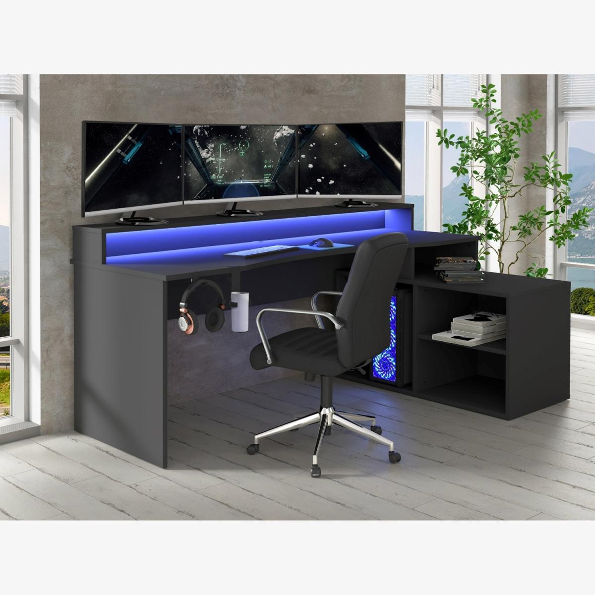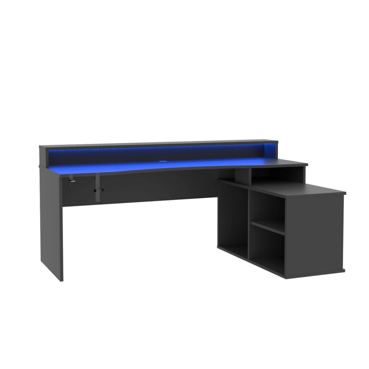 Features and Benefits:. - Elevated top shelf with space for three monitors. - Underneath LED lighting with red, blue, green, white, yellow, aqua, and purple options. - Handy remote control for adjusting light colour and brightness. - Useful storage area beneath the monitor shelf with a central cable port. - Spacious desktop for keyboard, mouse, and other essentials. - Ergonomic design for comfort. - Clip-on bottle holder and headphone hook for organisation. - Built-in storage unit with generous tower recess and two accessible open shelves. - Customisable tower/shelving unit, buildable on either side. - Contemporary black finish for a stylish look.