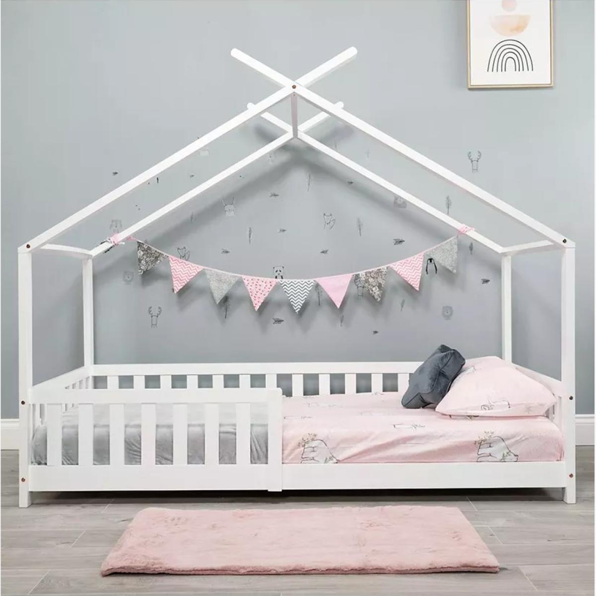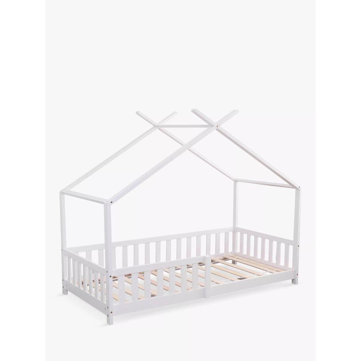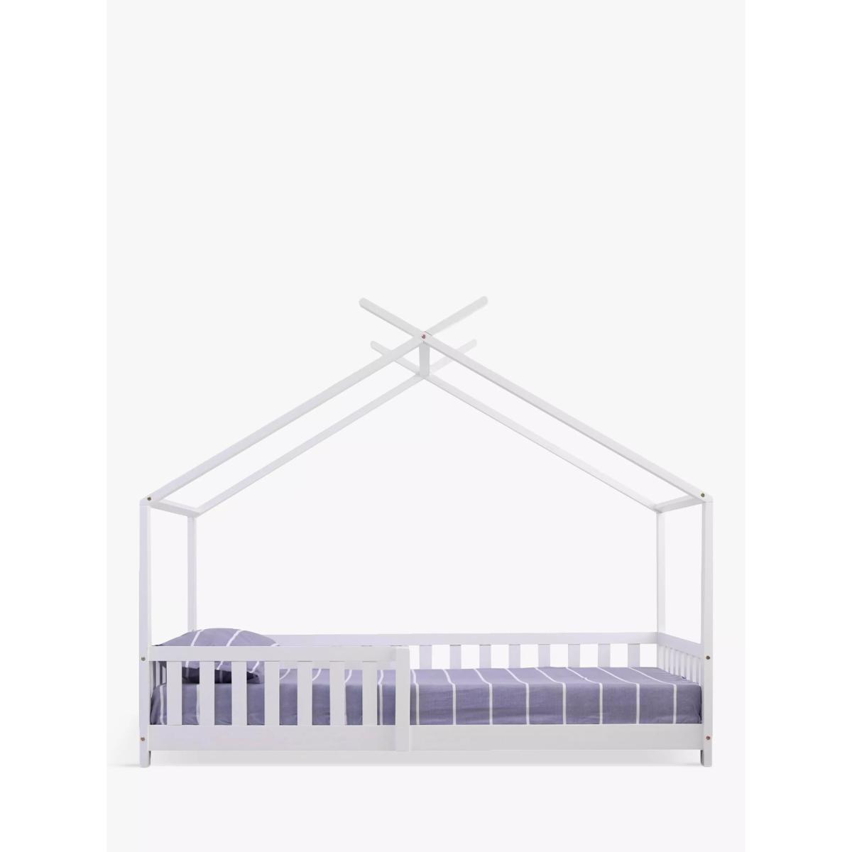 Designed with a beautiful pine crossover framework, this bed frame makes for a simple yet playful design. Made from solid pine with a practical painted finish, it can be used with draped fabric to create an eye-catching feature in their room. Worth Knowing: Child Compliant bed frames This bed conforms to BS 8509:2008+A1:2011 (Childrens beds for domestic use. Safety requirements and test methods). We recommend it is used with a standard single mattress, L190 x W90cm. Not suitable for children under the age of 4 years. Want to see it first? You may want to see and get a feel for the furniture in one of our shops before ordering. We'll be able to tell you where the range you'd like to view is on display.