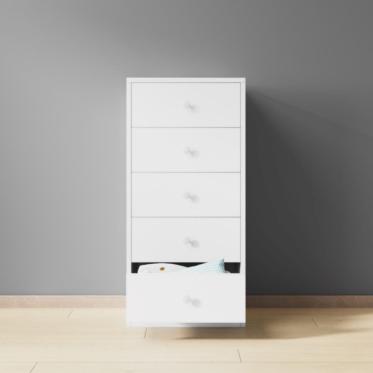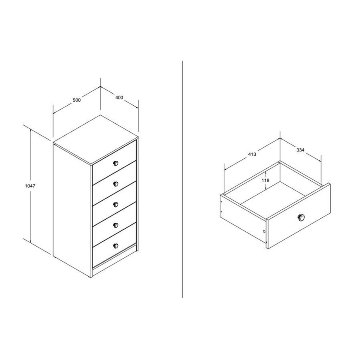 Consisting of five spacious drawers, the Wizard Chest of Drawers is a brilliant storage solution for any children's, teenagers', or students' bedroom. The white drawers are built from highly durable materials, ensuring a solid, hardy structure capable of withstanding family wear and tear. The understated white finish allows this product to be integrated with various furniture and other items from the Flair Furnishings Wizard range. The 500mm width of these drawers makes them suitable for smaller bedrooms while still providing ample storage. Alternatively, they can be used alongside oversized furniture in a larger space, bringing a stylish storage area to any bedroom.