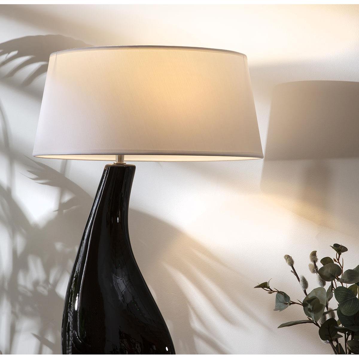 Elevate your space with this elegant table lamp, featuring a tall 56cm design with a black ceramic base and glamorous gloss black finish. Perfect as a modern lamp, it complements any room with its unique, curvey style and white fabric shade. Ideal for contemporary settings. This large lamp boasts a sleek modern design with a striking black ceramic base and curvey contours that add sophistication to any decor. The combination of gloss black and white, accented with silver metal hardware, creates a glamourous and stylish statement. The table lamp is topped with a white fabric shade that diffuses light beautifully, providing a warm and inviting glow. The shades clean, neutral colour enhances the lamps modern aesthetic, making it a versatile addition to various interiors. Designed to accommodate an E27 bulb - maximum of 15W (not included), this tall floor lamp is compatible with energy-efficient LED bulbs. W35cm D35cm H56cm E27 bulb required (max 15. W, not included) Ceramic Table Lamp