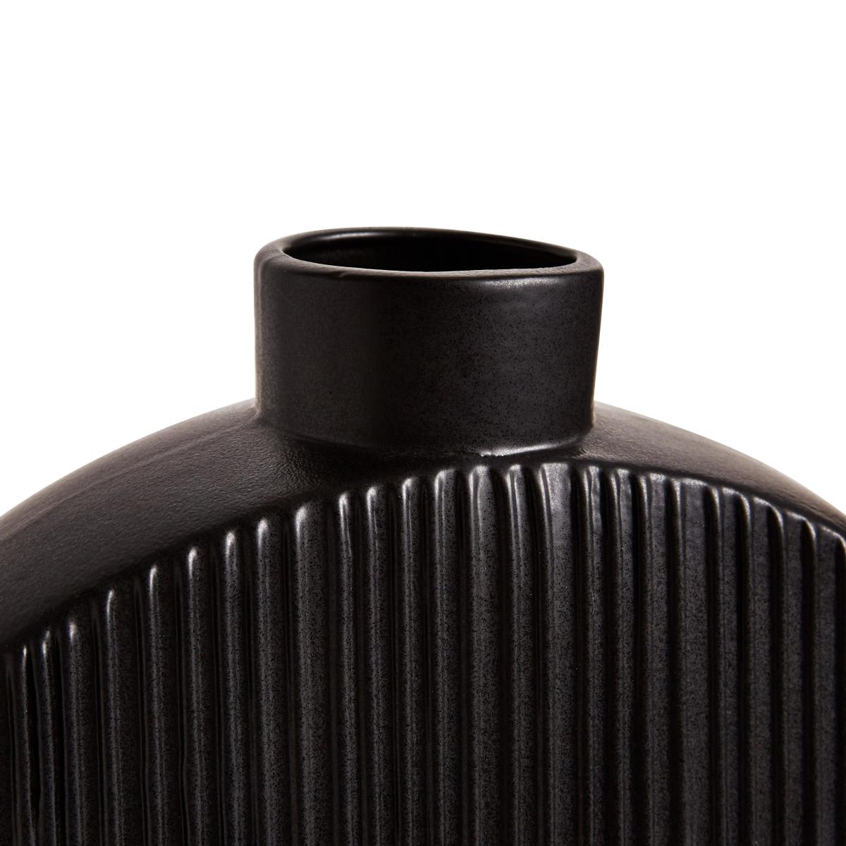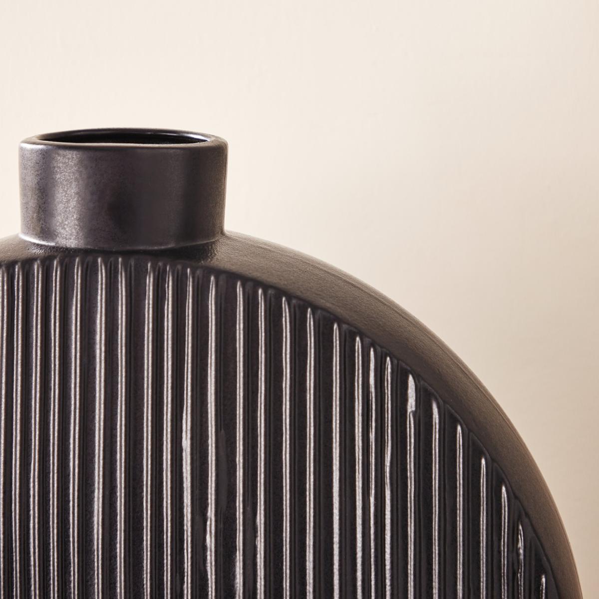 I love this flat circular vase for its minimal yet striking design. Its monochrome palette of black and white makes it versatile, perfectly suited to modern, contemporary, or even industrial interiors. It works particularly well as a standalone statement piece on a sideboard, console table, or mantel, where its simple form can be appreciated. For styling, I recommend filling it with tall, textural stems like dried grasses or pampas to enhance its natural vibe, or leaving it empty to highlight its clean lines. Its size and shape make it ideal for both subtle accents or bold displays, depending on your space.
