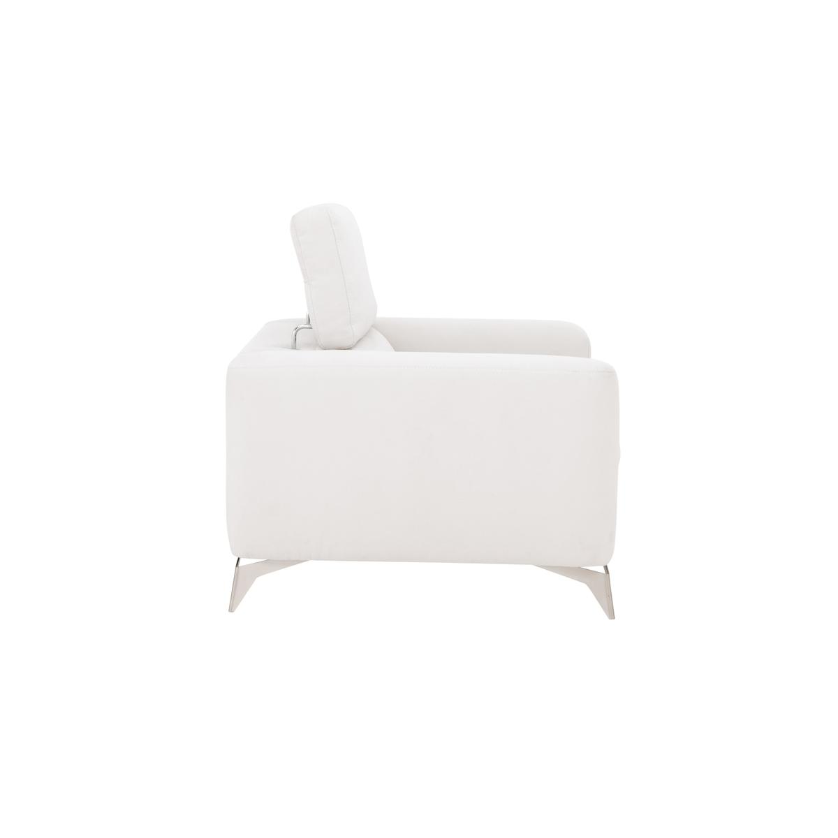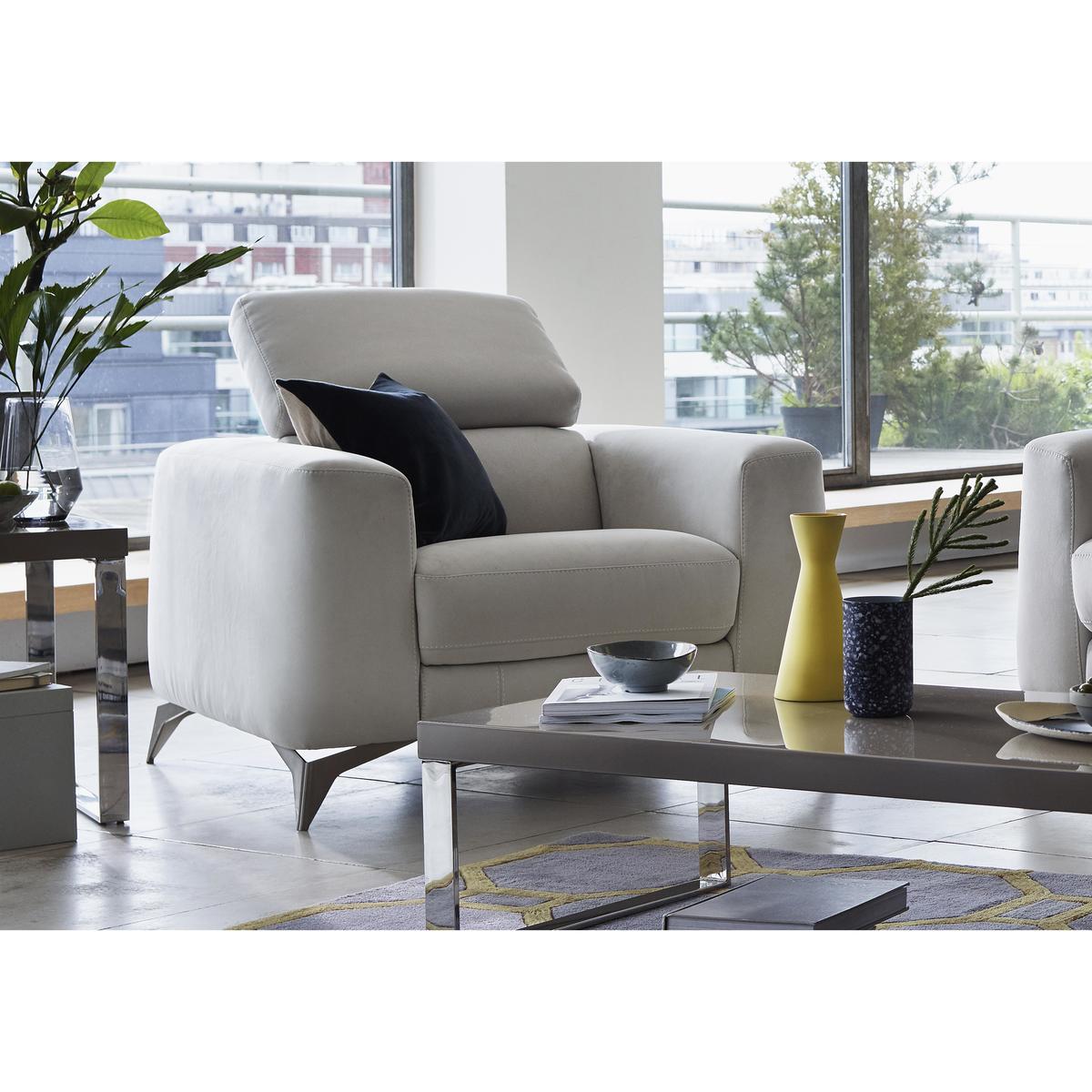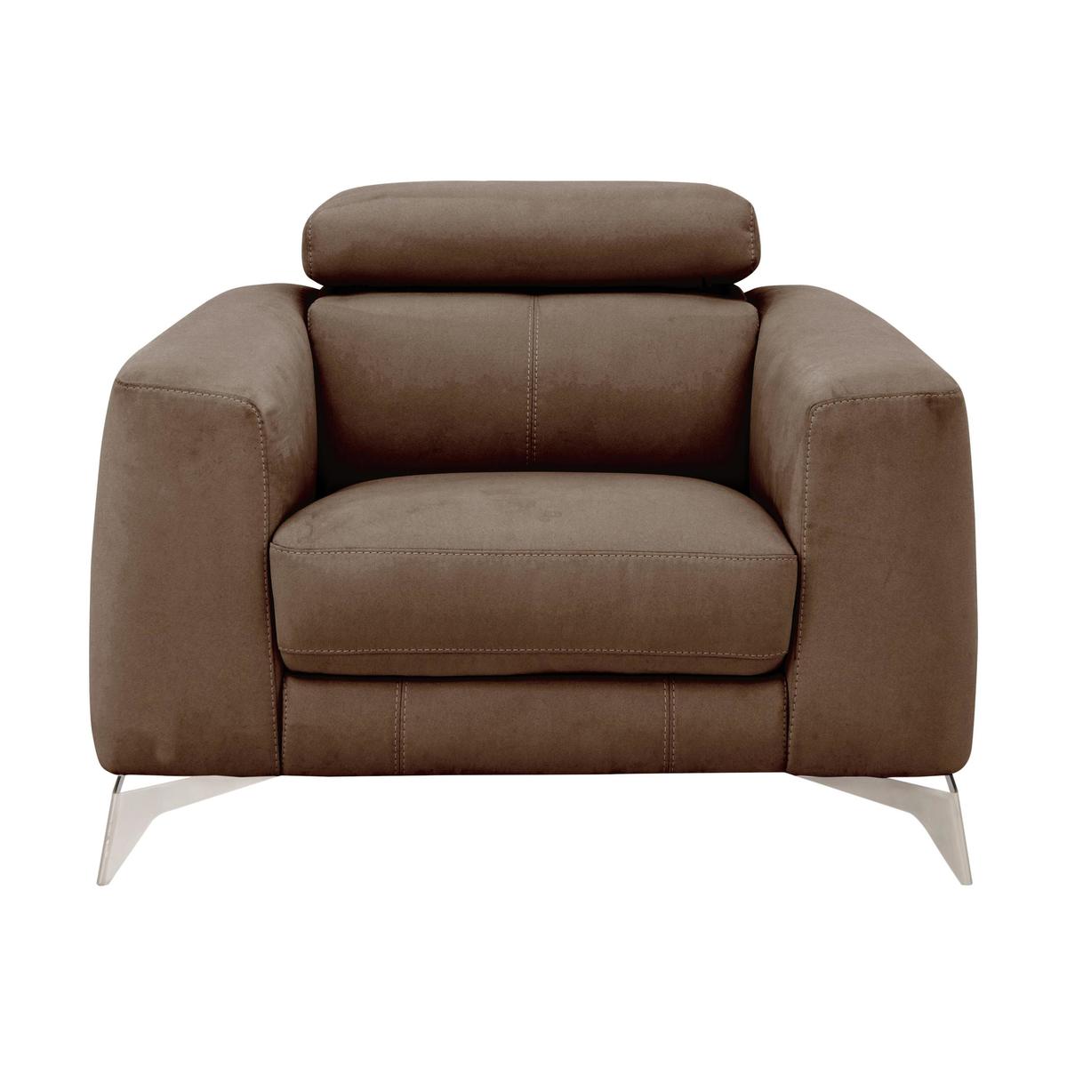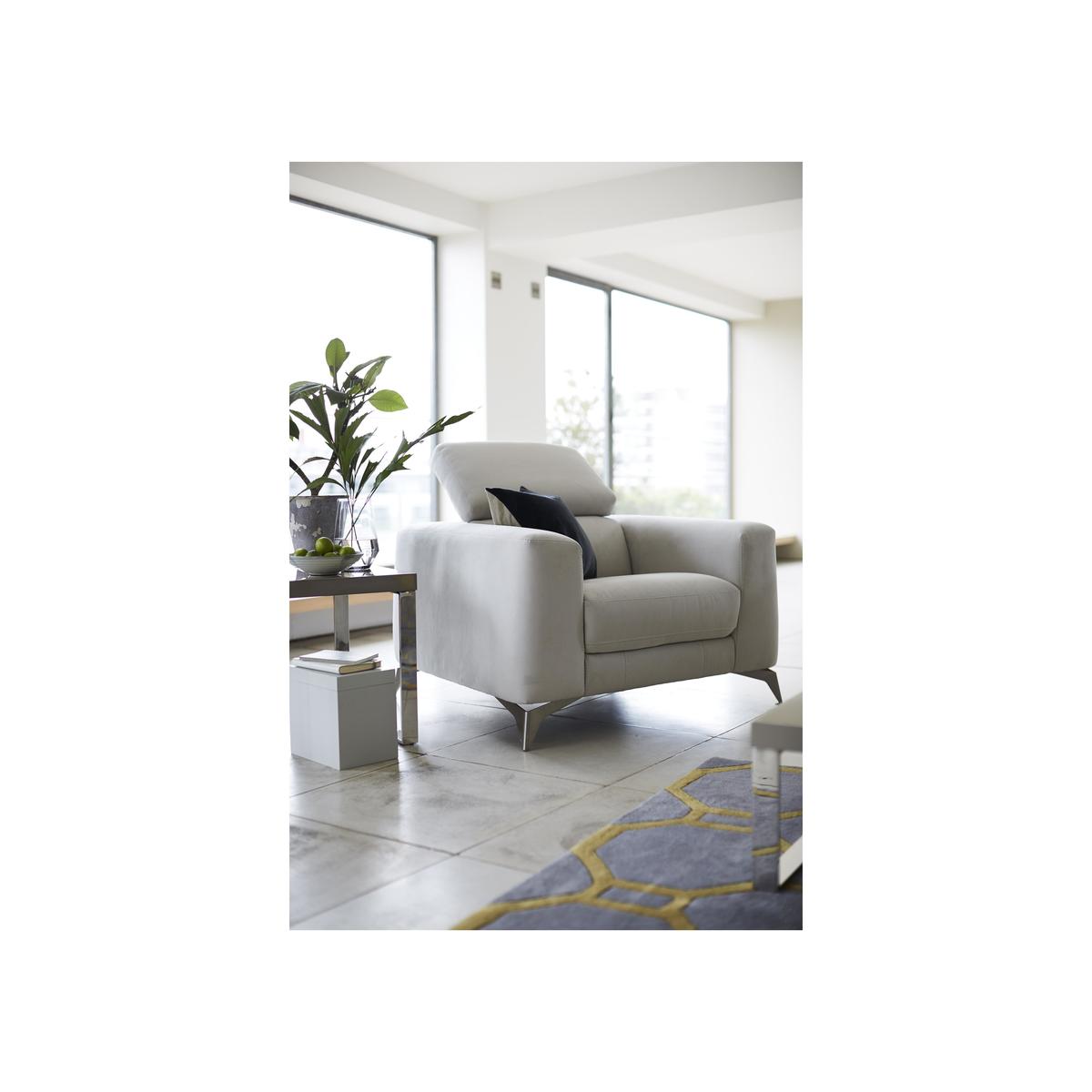 Contemporary armchair, exclusive to Furniture Village. Soft-touch fabric covers in a choice of colours. Fashionable low back and stylish square arms. High-density foam seat cushions for comfort and support. Easy-to-adjust ratchet headrest. Shaped, chrome-effect feet. New improved design with higher density foam cushioning and no-sag spring. Sleek designer looks at a very competitive price