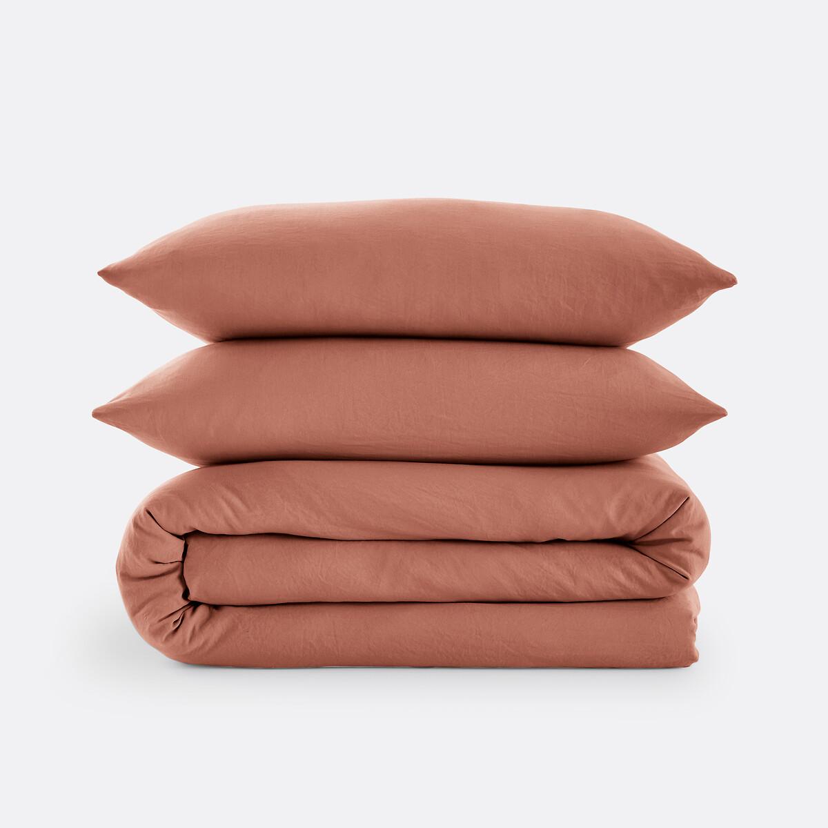A trendy colour palette, a slightly wrinkled matte appearance and an ultra-soft touch: this bed linen is made from washed recycled microfibre, a soft, light, comfortable and easy-to-wear material. Plain, it fits easily into the decoration of a room. This set includes the duvet cover and its matching rectangular pillowcase. Product Details • 100% polyester 95g/m2 • Recycled polyester • Washed microfibre • Straight buttoned base for the duvet cover. Care Advice • Machine washable at 60°C • By washing your laundry at 40°C instead of 60°C, you limit energy consumption. Sizes • Duvet cover 140 x 200cm + 1 pillowcase 50 x 70cm: Single • Duvet cover 200 x 200cm + 2 pillowcases 50 x 70cm: Double • Duvet cover 240 x 220cm + 2 pillowcases 50 x 70cm: King • Duvet cover 260 x 240cm + 2 pillowcases 50 x 70cm: Super King • Recycled polyester. Using recycled polyester is all about conserving resources and reducing waste.