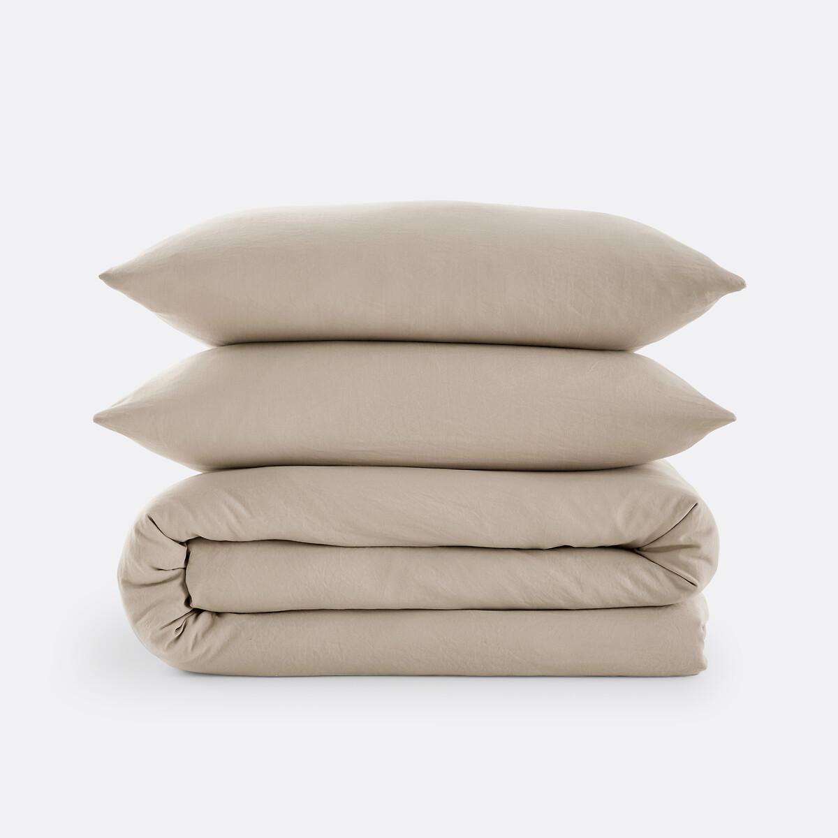 A trendy colour palette, a slightly wrinkled matte appearance and an ultra-soft touch: this bed linen is made from washed recycled microfibre, a soft, light, comfortable and easy-to-wear material. Plain, it fits easily into the decoration of a room. This set includes the duvet cover and its matching rectangular pillowcase. Product Details • 100% polyester 95g/m2 • Recycled polyester • Washed microfibre • Straight buttoned base for the duvet cover. Care Advice • Machine washable at 60°C • By washing your laundry at 40°C instead of 60°C, you limit energy consumption. Sizes • Duvet cover 140 x 200cm + 1 pillowcase 50 x 70cm: Single • Duvet cover 200 x 200cm + 2 pillowcases 50 x 70cm: Double • Duvet cover 240 x 220cm + 2 pillowcases 50 x 70cm: King • Duvet cover 260 x 240cm + 2 pillowcases 50 x 70cm: Super King • Recycled polyester. Using recycled polyester is all about conserving resources and reducing waste.