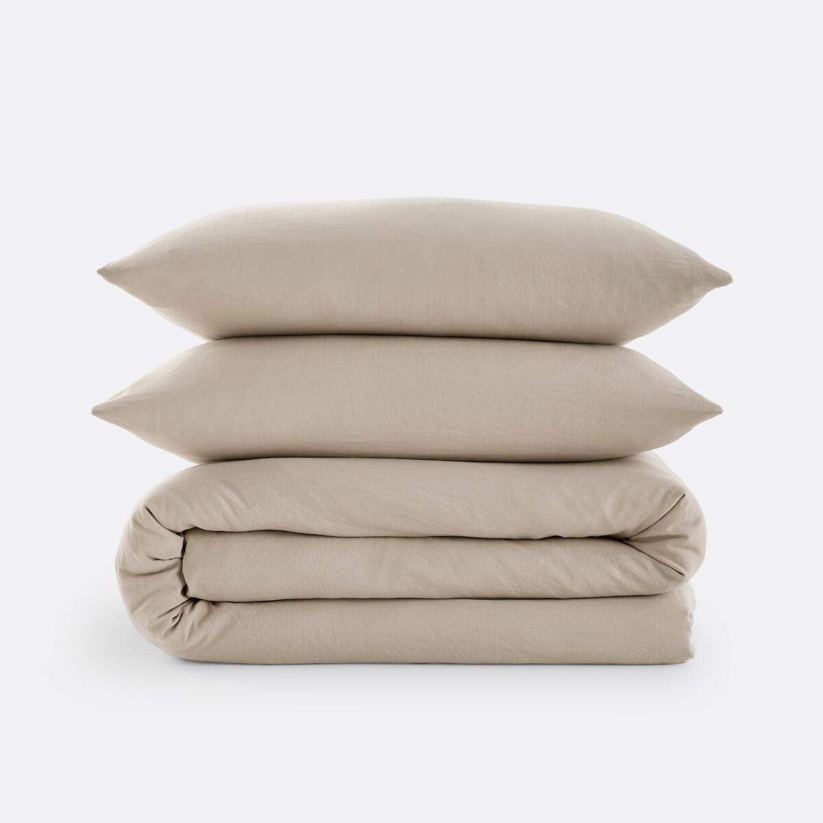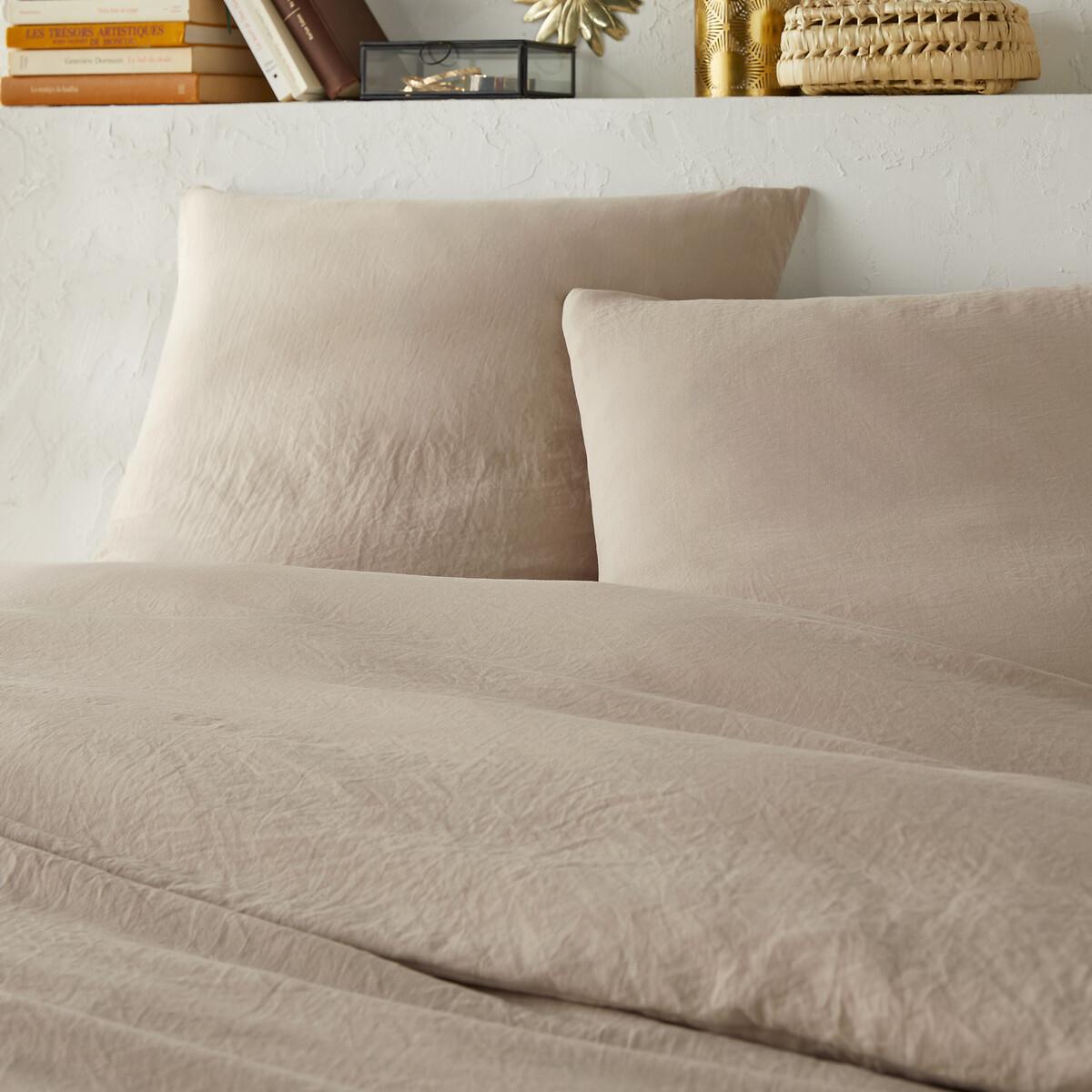 A trendy colour palette, a slightly wrinkled matte appearance and an ultra-soft touch: this bed linen is made from washed recycled microfibre, a soft, light, comfortable and easy-to-wear material. Plain, it fits easily into the decoration of a room. This set includes the duvet cover and its matching square pillowcase. Product Details • 100% polyester 95g/m2 • Recycled polyester • Washed microfibre • Straight buttoned base for the duvet cover. Care Advice • Machine washable at 60°C • By washing your laundry at 40°C instead of 60°C, you limit energy consumption. Sizes • Duvet cover 140 x 200cm + 1 pillowcase 63 x 63cm : Single • Duvet cover 200 x 200cm + 2 pillowcases 63 x 63cm : Double • Duvet cover 240 x 220cm + 2 pillowcases 63 x 63cm : King • Duvet cover 260 x 240cm + 2 pillowcases 63 x 63cm : Super King • Recycled polyester. Using recycled polyester is all about conserving resources and reducing waste.