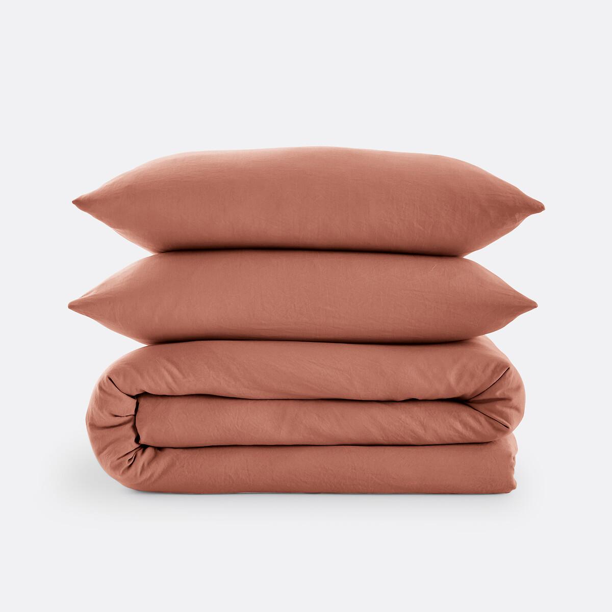 A trendy colour palette, a slightly wrinkled matte appearance and an ultra-soft touch: this bed linen is made from washed recycled microfibre, a soft, light, comfortable and easy-to-wear material. Plain, it fits easily into the decoration of a room. This set includes the duvet cover and its matching square pillowcase. Product Details • 100% polyester 95g/m2 • Recycled polyester • Washed microfibre • Straight buttoned base for the duvet cover. Care Advice • Machine washable at 60°C • By washing your laundry at 40°C instead of 60°C, you limit energy consumption. Sizes • Duvet cover 140 x 200cm + 1 pillowcase 63 x 63cm : Single • Duvet cover 200 x 200cm + 2 pillowcases 63 x 63cm : Double • Duvet cover 240 x 220cm + 2 pillowcases 63 x 63cm : King • Duvet cover 260 x 240cm + 2 pillowcases 63 x 63cm : Super King • Recycled polyester. Using recycled polyester is all about conserving resources and reducing waste.