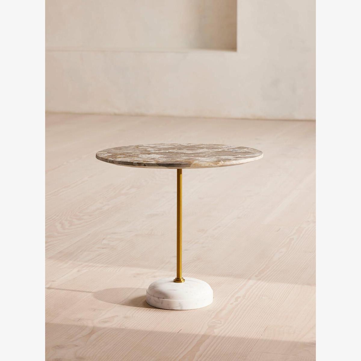 Our Fleet side table features a Kapri marble top, sourced from India and characterised by a beige base with pockets of brown, grey and rust veining. This has been applied with a satin finish for a luxurious handle. A central stem in antique brass elevates this marble design through a contemporary mix of materials, while referencing similar finishes seen in 180 House.