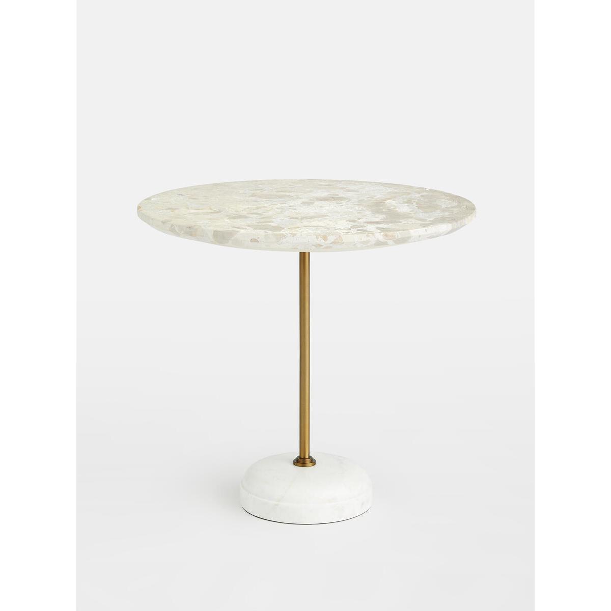 This Fleet side table has a white marble top and single brassleg for a sculptural feel, and its weighty base secures it firmlyin place. We love it grouped together with its versions in Kapristone and green marble to create an interesting contrast of heightsand textures. It's inspired by the tables found at 180 House. White marble top. Variations in the marble make each piece unique. Brass leg. Made in India. Inspired by 180 House.
