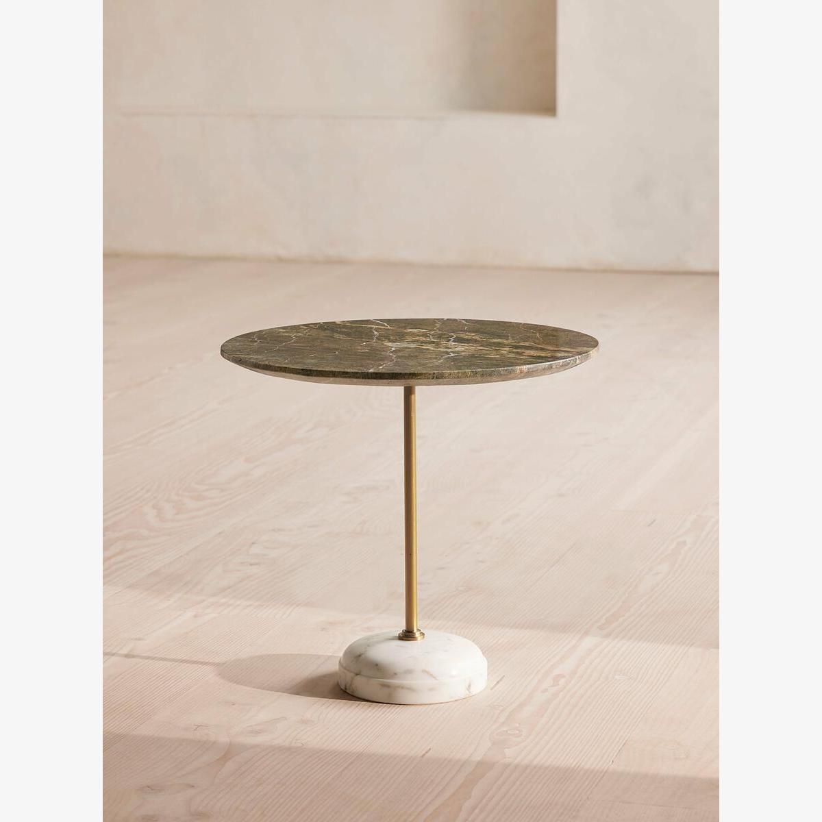 Our Fleet side table features a Verde Bosque marble top, sourced from India and characterised by a deep green base and veins of black, green, brown and red, akin to the colours of the Indian Rainforest. A central stem in antique brass and satin finishes elevate this marble design through a contemporary mix of materials, while referencing similar finishes seen in 180 House.