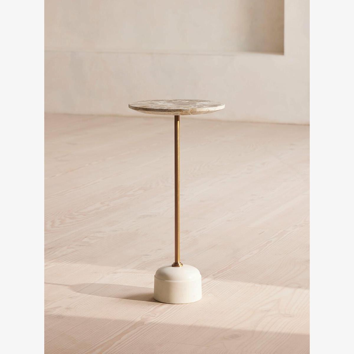 Our Fleet side table features a Kapri marble top, sourced from India and characterised by a beige base with pockets of brown, grey and rust veining. A central stem in antique brass and satin finishes elevate this marble design through a contemporary mix of materials, while referencing similar finishes seen in 180 House.