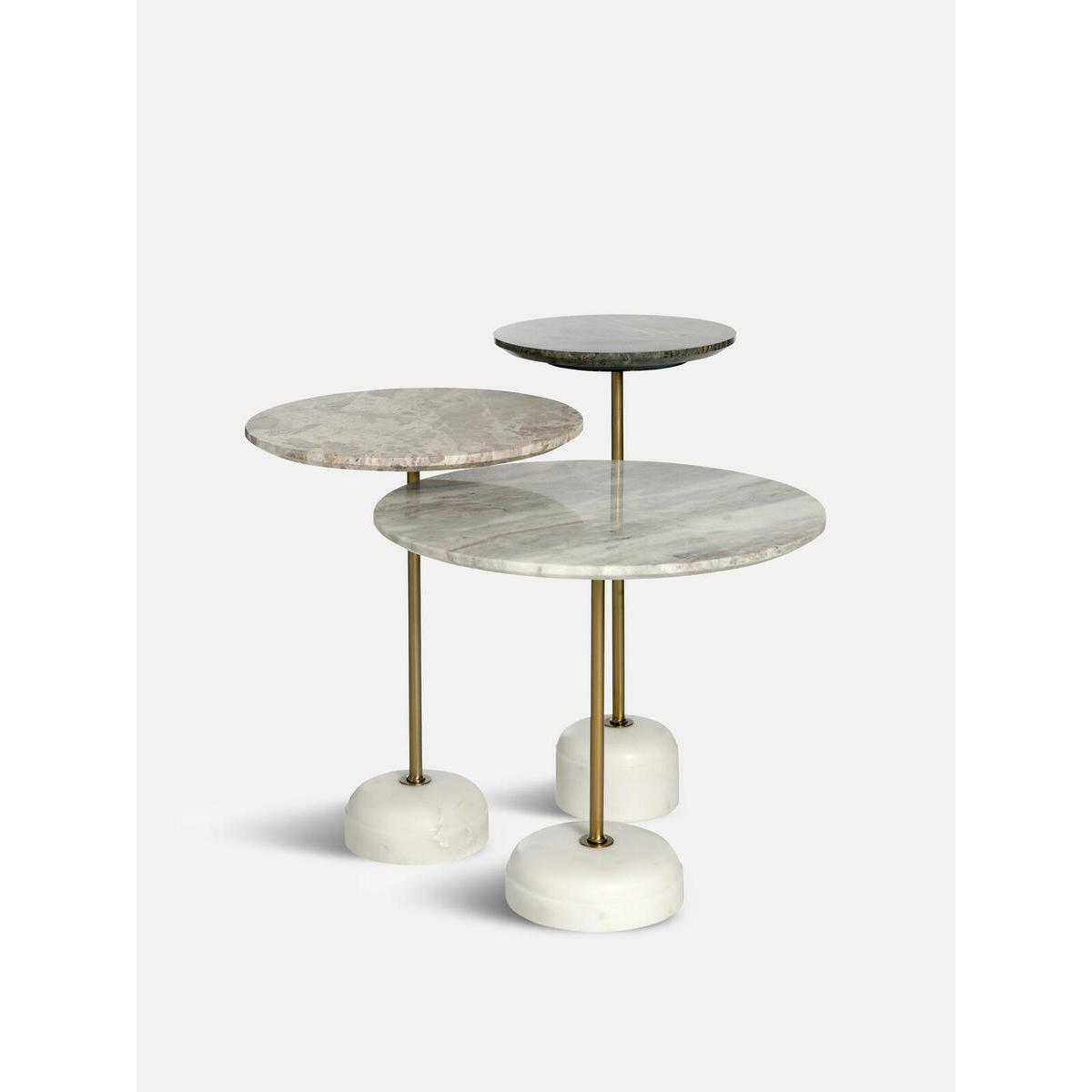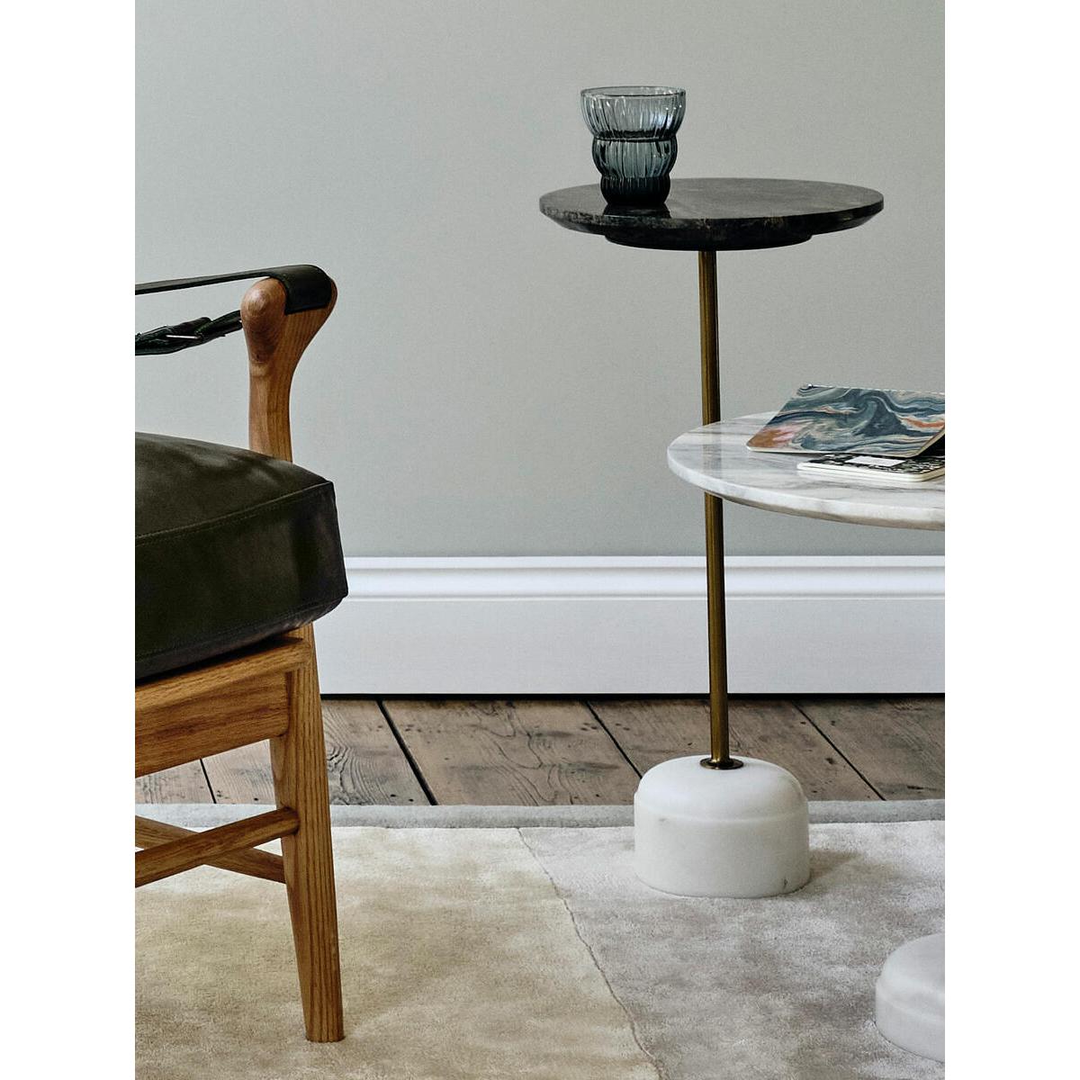This Fleet side table has a solid, green marble top and a singlebrass leg for a sculptural feel. The weighty base secures it firmlyin place. We love it grouped together with the Kapri stone andwhite marble versions to create an interesting contrast of heightsand textures. Green marble top, brass leg. Variations in the marble make each piece unique. Made in India. Inspired by 180 House.