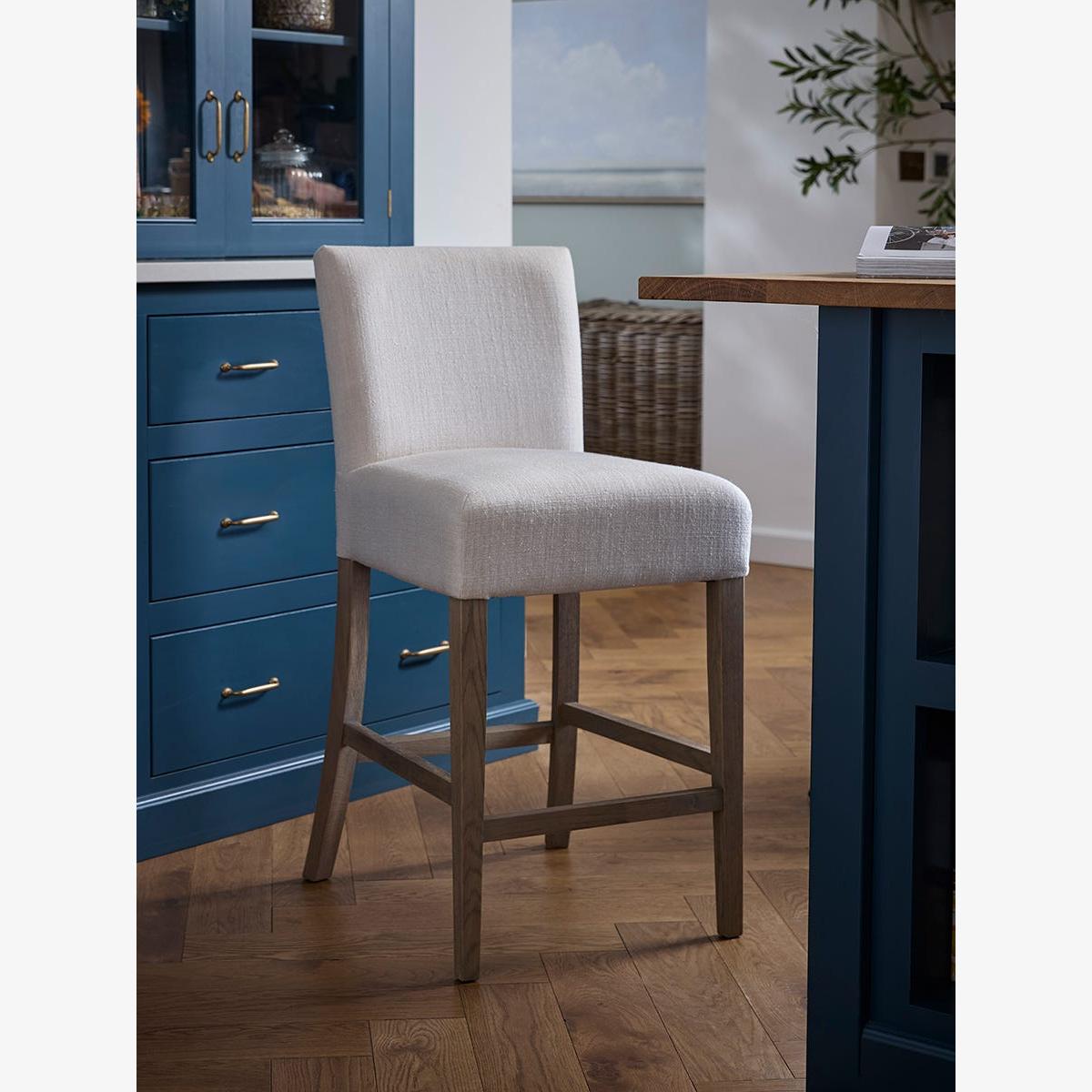 The perfect addition to your island, this upholstered counter stool has a frame crafted from white oak and birch with a foam-filled upholstered seat, providing style and comfort to your kitchen.  Handmade for a natural and organic finish, its neutral tones contrast with the dark wood frame and fit wonderfully in our Faded Elegance trend.