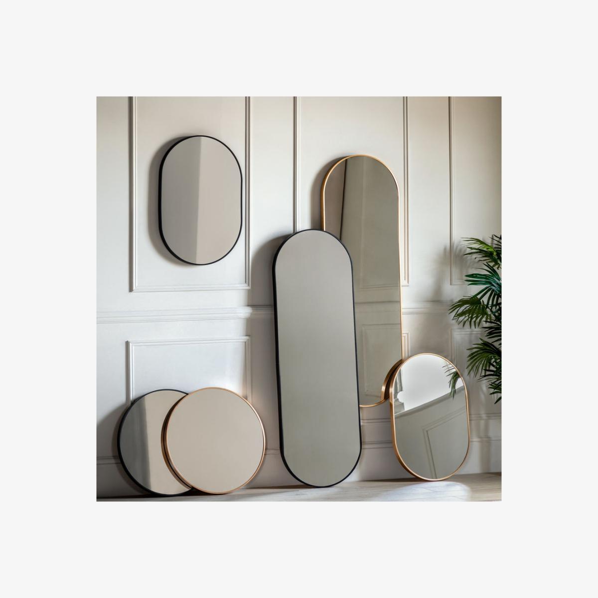 Shape: Round. Material:Glass / MDF / Aluminium. Colour/Finish: Gold. Friendly rounded shapes of the Fletcher mirror set in a simple Gold frame add some clean lines to your wall. Availble is 3 sizes.