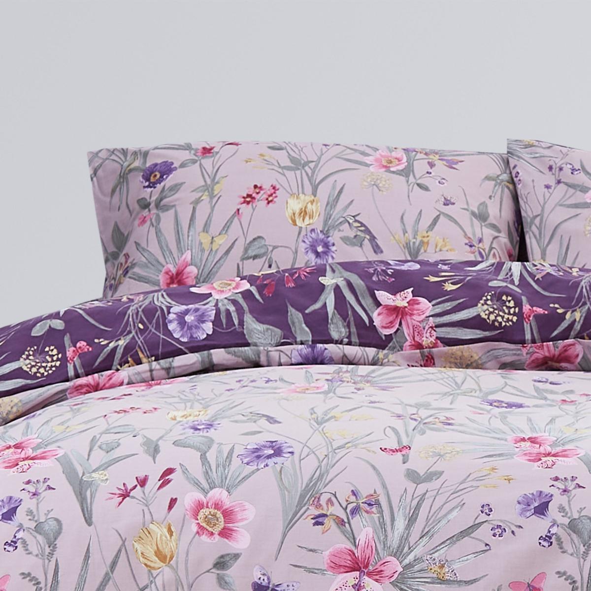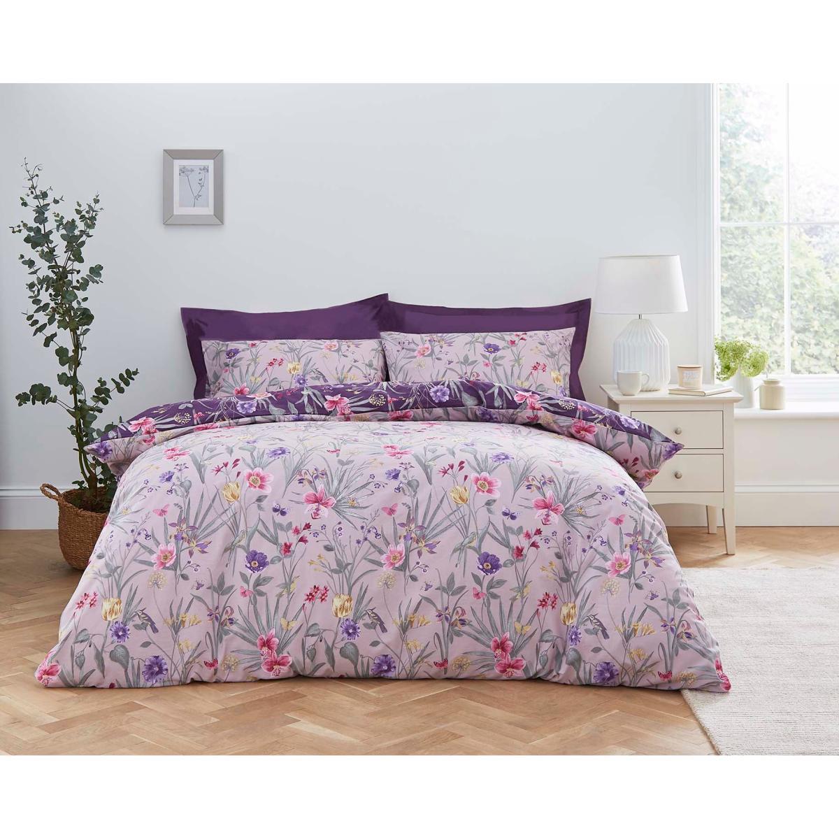 Fleur Floral Purple 100% Cotton Reversible Duvet Cover and Pillowcase Set Purple