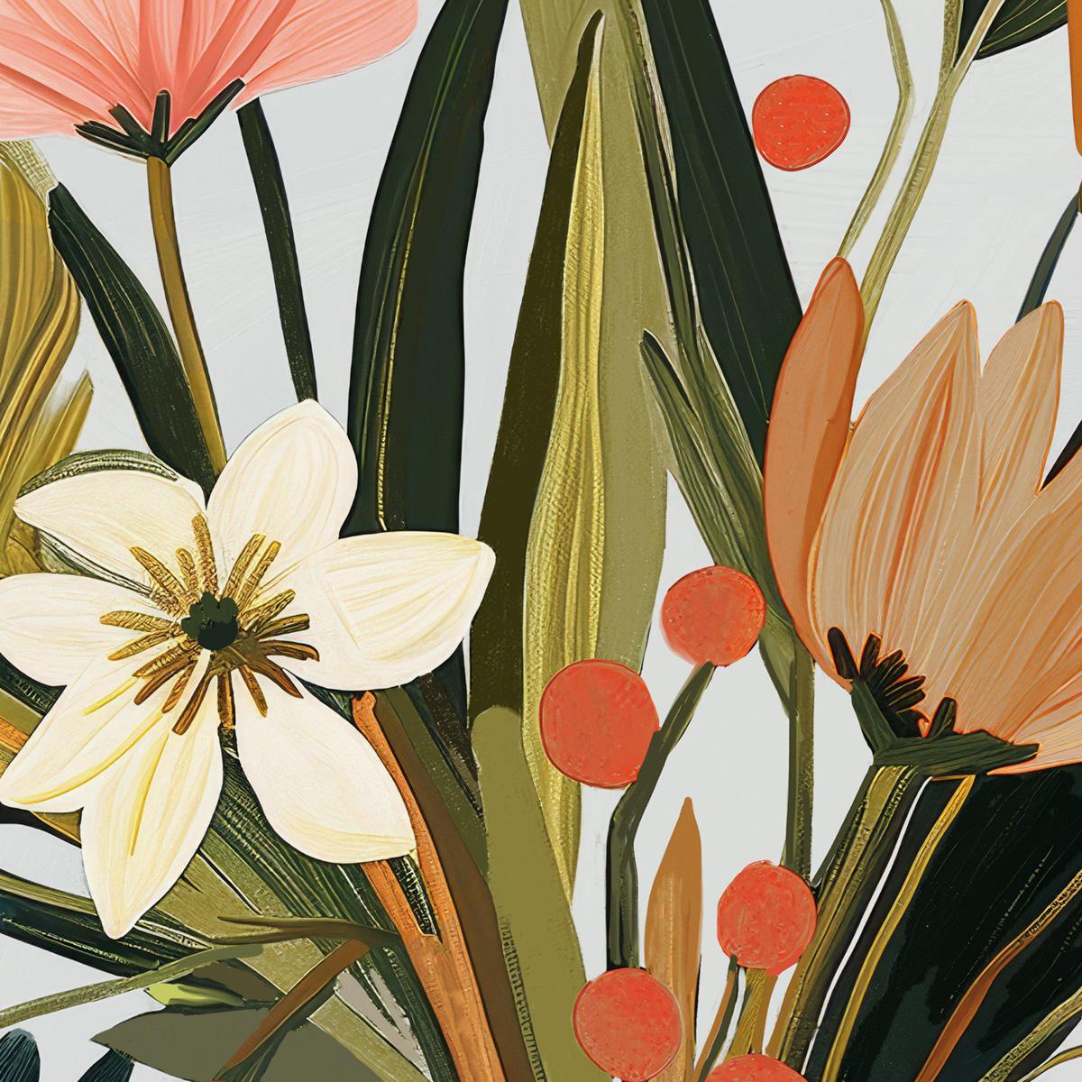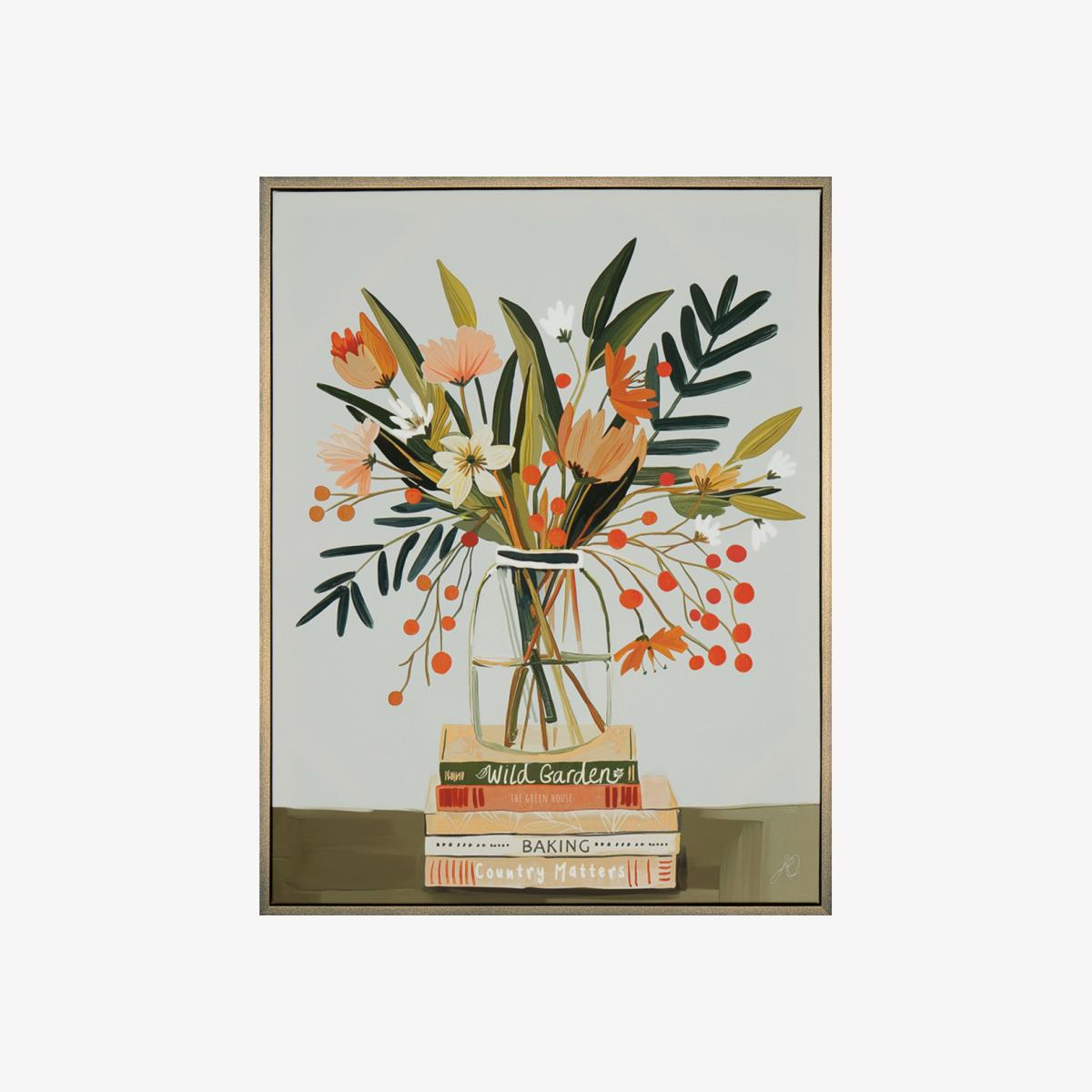 Brighten your space with Fleur, a stunning mid-century inspired wall art piece that showcases a vibrant floral arrangement placed on top of a neatly arranged stack of books. Set against a timeless backdrop, this artwork blends vintage charm with modern elegance, making it the perfect statement piece for any room.