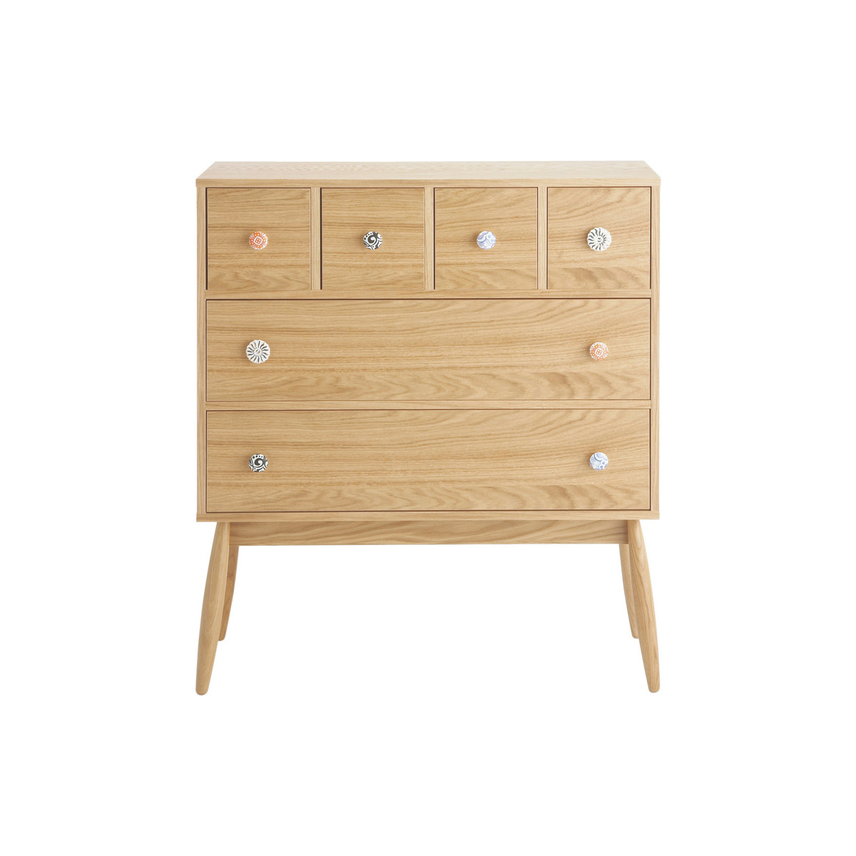 I love this piece because it combines classic oak warmth with a playful twist thanks to the patterned ceramic handles. It works particularly well in Scandi-inspired interiors, where its natural wood tone complements neutral palettes, but it can also add a touch of charm to more eclectic or vintage schemes. Practical styling tips include balancing its clean lines with textured accessories like woven baskets or soft textiles. For a contemporary look, try pairing it with statement lamps or colourful ornaments on top, while for a more pared-back aesthetic, keep the surface decluttered and let the handles be the focal point. This chest of drawers is versatile and can work in bedrooms, living spaces, or even a stylish hallway where storage meets design.