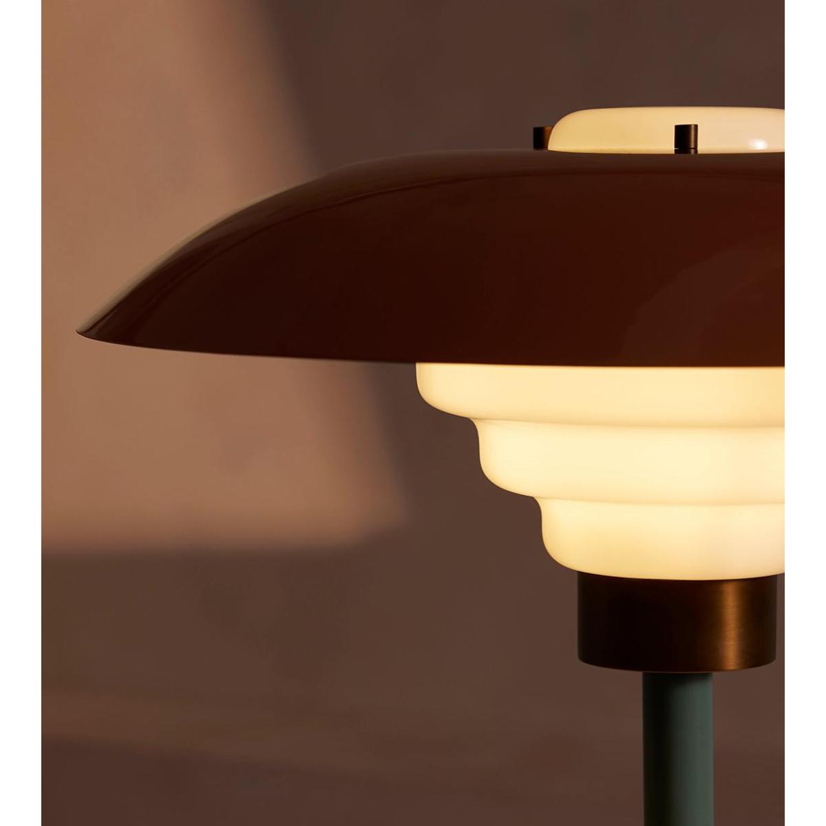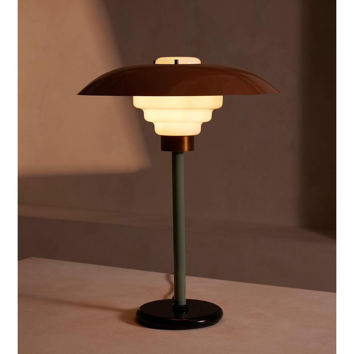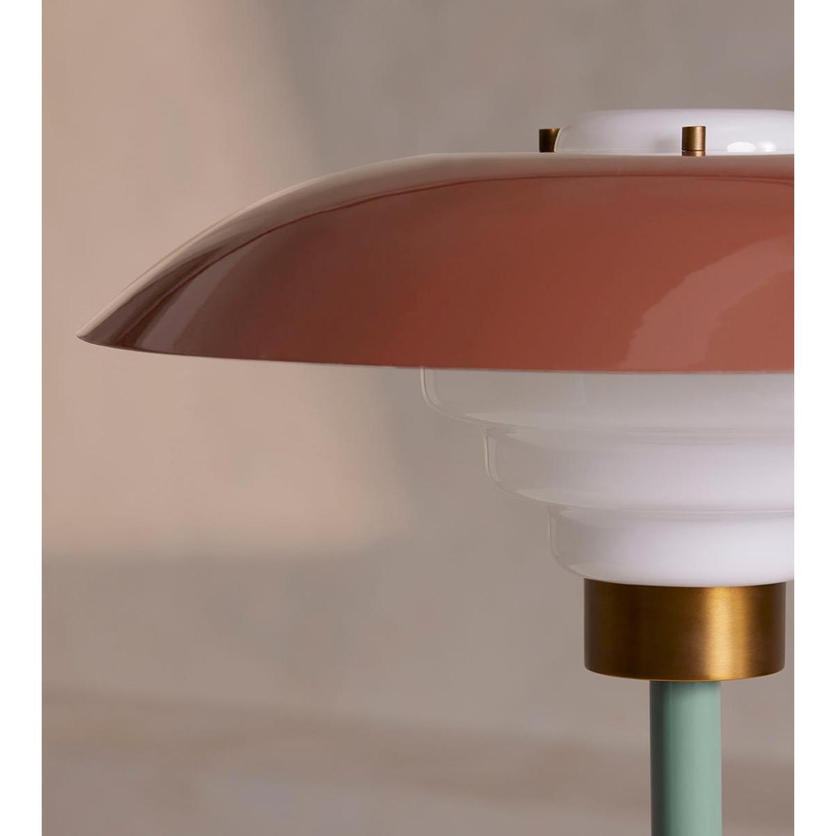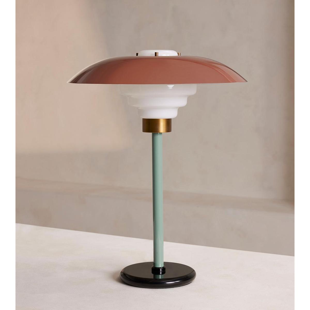 A mix of milky-white glass and lacquered, sprayed metals in subtly contrasting shades creates an architectural design. Named for its floral-shaped silhouette, the Fleur table lamp has a subtly domed metal shade that covers a tiered, milky-white glass bulb. Underneath, a slender stem is secured by a circular base with a high-gloss sheen.
