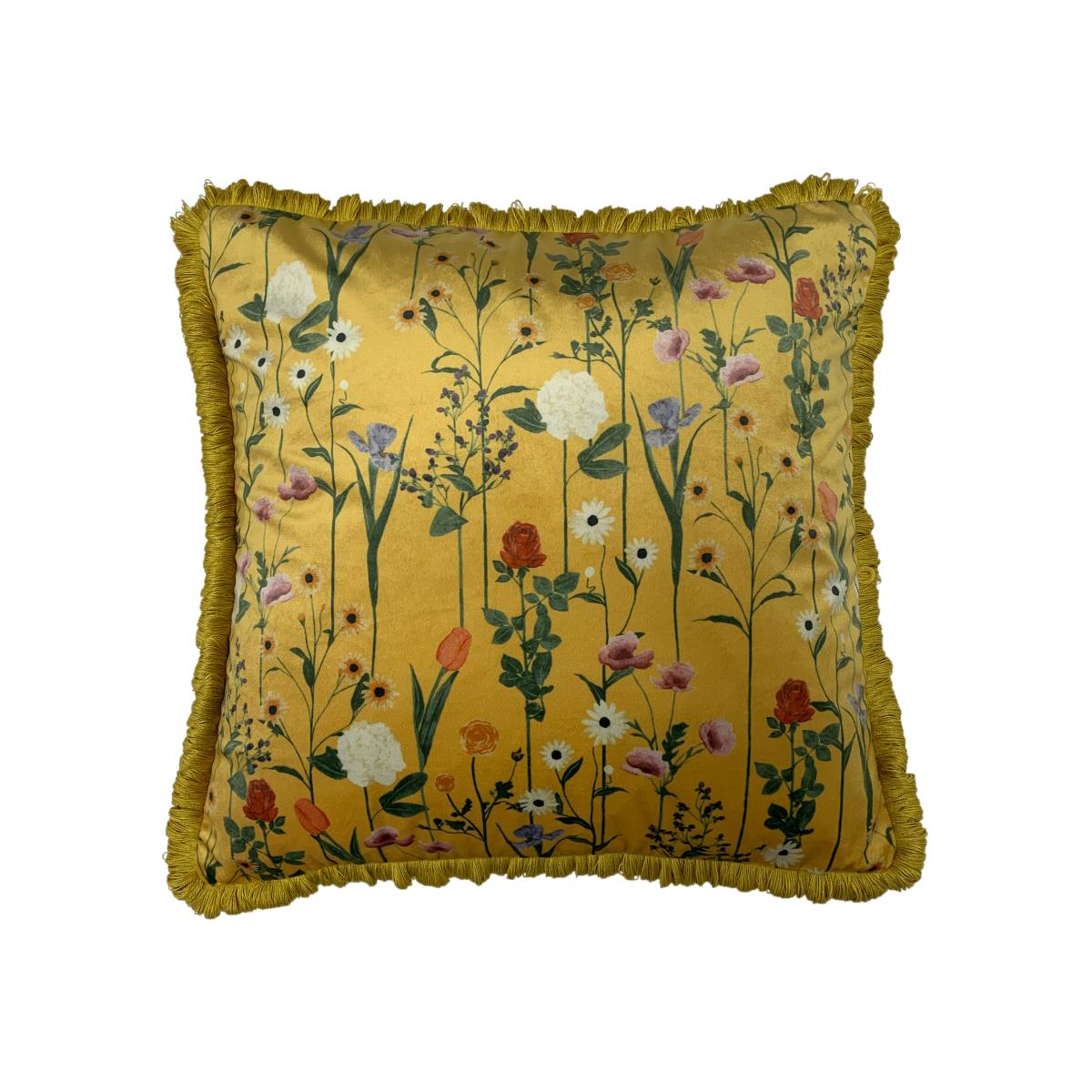 A beautiful and bold hand-painted botanical print, Fleura features delicate stems of soft petalled flowers on a plush ochre velvet. Finished with soft looped fringe trim, this cushion is an eye-catching accessory suitable for any space.