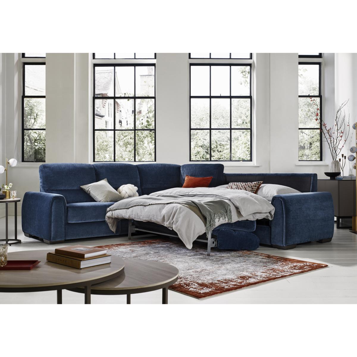 Flex by name and flexible by nature, this modular collection is laden with fabulous comfort features and offers literally hundreds of different options – although you may be quite happy to choose from our list of pre-configured pieces. There you’ll find a wide choice of sofas, corner sofas, chairs and sofa beds with optional power recliners and nifty storage drawers hidden in the arms. With a cupholder and two storage compartments in each, they're ideal for keeping a few beverages and the TV remote close at hand as you relax in perfect comfort on the sprung seat cushions. Offered in a very wide range of high-quality fabric and 100% leather upholstery options, the Flex range is handmade exclusively for Furniture Village. Fabulous corner sofa by day, super-comfy double bed by night. This large corner sofa bed, part of our modular Flex range, has sprung seats, sprung seat cushioning, a foam mattress and a storage arm. Why you’ll love it Our Flex range is plush and lush and laden with comfort features. Sitting is believing. This large corner sofa bed’s sprung seat cushions feel amazing. And its sprung seat suspension evenly distributes body weight for better support. A clever storage drawer – complete with cup holder – pulls out from an arm. With a double-size high-quality foam mattress, it’s just as comfortable when converted to a bed. Stylish design with deep seats and wide rounded arms enhances your comfort. Higher profile backs and strategic feature stitching targets improved lumbar support. In a wide choice of luxuriously soft fabrics. Also available with 100% leather upholstery. You can have the bed on the left- or the right-hand side. Made by hand. Only at Furniture Village. This large corner sofa bed is part of our modular Flex range. Create your bespoke sofa with Flex. What you need to know Medium comfort level. Seat suspension: no-sag spring. Seat cushioning: foam and inner coil spring. Cushioning is fixed. Back suspension: rubber webbing. Back cushioning: loose fibre. Cushioning is fixed. Arm cushioning: foam and fibre. Back and arms are removable for easier delivery. Left-hand facing corner sofa bed has the bed on the left as you face the sofa bed. Right-hand facing corner sofa bed has the bed on the right as you face the sofa bed. Seats will be firmer because of the underlying sofa bed mechanism. Please follow sofa bed opening instructions carefully. Forcing the mechanism will cause damage. This sofa bed’s ratchets will make a clicking sound while being adjusted. This is not a fault. Upholstery will be slightly relaxed to facilitate sofa bed mechanism. Fixed seat and back cushions require smoothing and straightening regularly. To smooth and straighten fixed cushions, punch the back cushion’s top two corners and the seat cushion’s outer two corners, and pinch outwards. Some fabrics can show wear on areas of more use or in direct sunlight. Clean regularly using a soft brush or vacuum with the curtain attachment. Deal with any spills promptly. Professional cleaning advised for oil- and grease-based stains. Please read our upholstery care guide for more advice. Item code: FL-XLSBCLUX-044