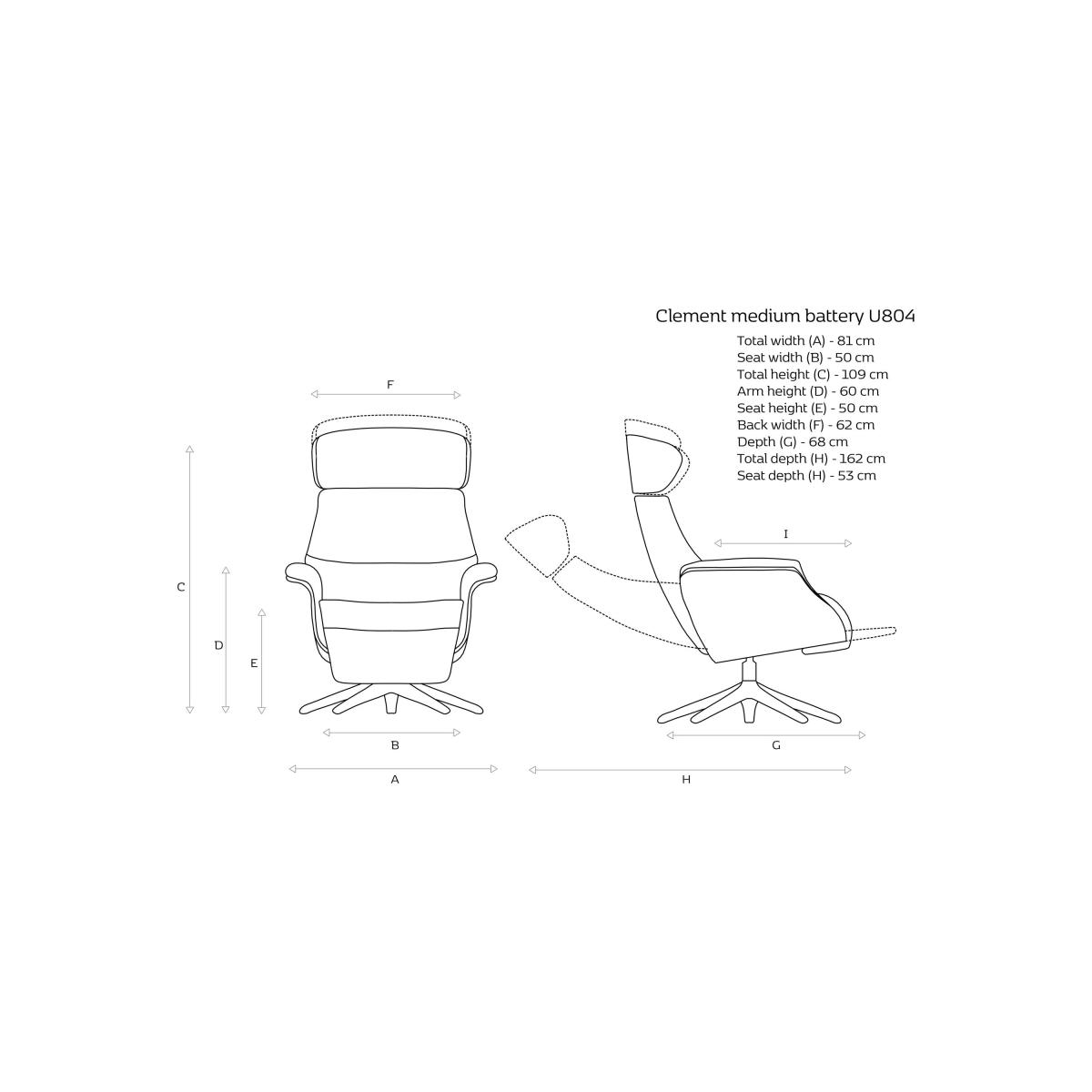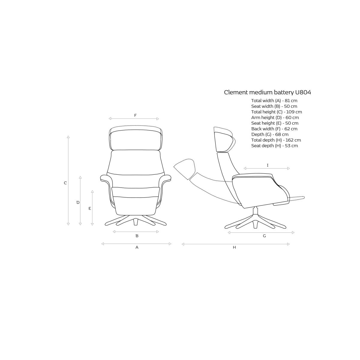 Product Information The Clement Relax Chair with an integrated footrest combines modern elegance with unparalleled comfort. Its electric adjustment allows you to seamlessly change the back angle and footrest position using a discreet motion touch panel. Featuring an adjustable headrest and available in various premium fabrics and leathers, the Clement is the ultimate blend of functionality and style. The chair is battery-powered for convenience and flexibility, with black aluminium legs and a choice of wood finish options. Try before you buyWe're confident in our furniture's quality, but it's always a good idea to check that it's a good personal fit for you. Working in partnership with ClearabeeIf you need help disposing of your old sofa when ordering a new one we have teamed up with Clearabee to offer a convenient and cost effective solution, diverting 100% of products from landfill*. Find out more by visiting our Clearabee partner page below. *Products will be exited via energy from waste exit routes and diverted from landfill in compliance with regulations. Measuring Up for Furniture Guide Sofas, Sofa Beds & Chairs Buying Guide Upholstery Care Guide Clearabee Sofa Collection Service