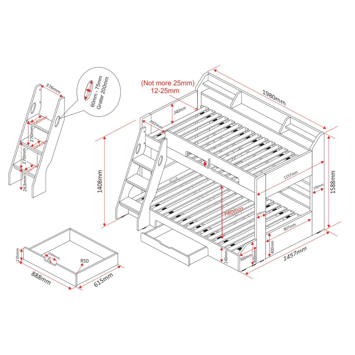 * 1 x single bunk and 1 x small double bed* Raised side panelling* Spacious shelving* Underbed drawer This bed cleverly combines a small double mattress on the lower bunk with a single mattress on the top, allowing up to three individuals to sleep comfortably while maximising floor space. This stylish bunk bed is not only perfect for smaller bedrooms but also complements various other furniture pieces due to its blend of traditional and modern design elements. Safety is a key feature, with raised side panelling and high headboards and footboards on the top bunk. Designed with practicality in mind, it features full-length shelving on both bunks and a spacious under-bed drawer on wheels with a cut-out handle for easy access.