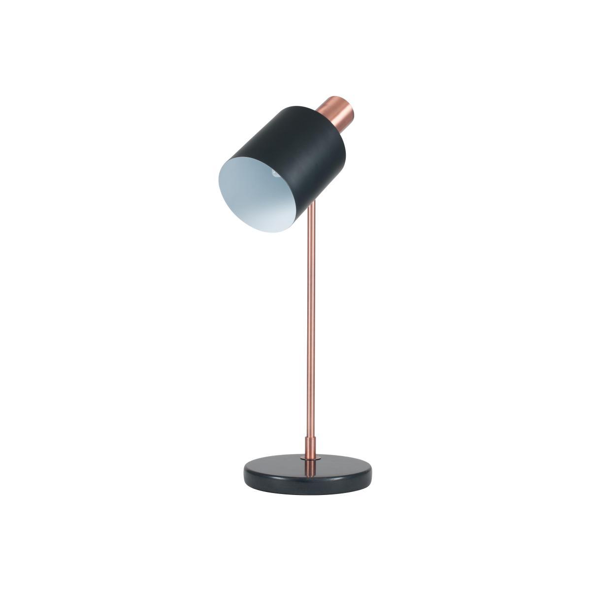 Melding materials, textures and tones, the Flin task table lamp is a sleek and elegant table lamp that adds a touch of designer flair to a living space, a home office, or even a bedroom. A metal shade, cylindrical in shape, is supported on polished metallic neck and circular marble base. The head is movable, making this the perfect task lamp for reading or writing. Bringing a sophisticated interpretation of the popular modern industrial trend to your home, the Flin task table lamp is available in two colourways – black and antique copper, and white and gold. This stylish range also includes a floor lamp and a ceiling pendant. Dimensions. Width: 18cm (7in). Depth: 26cm (10in). Height: 52cm (20in).