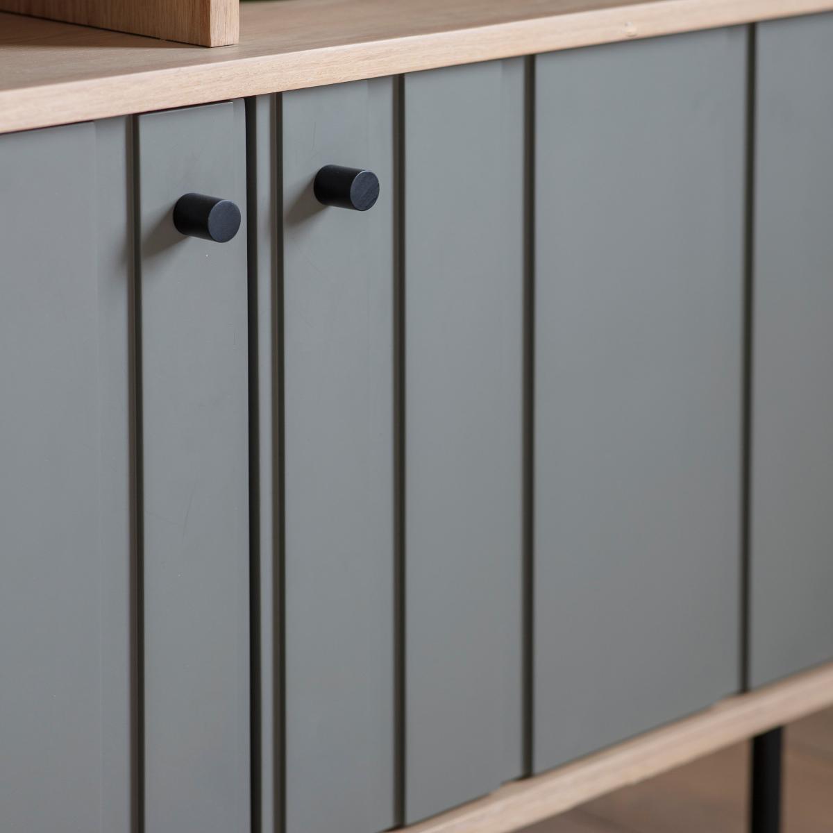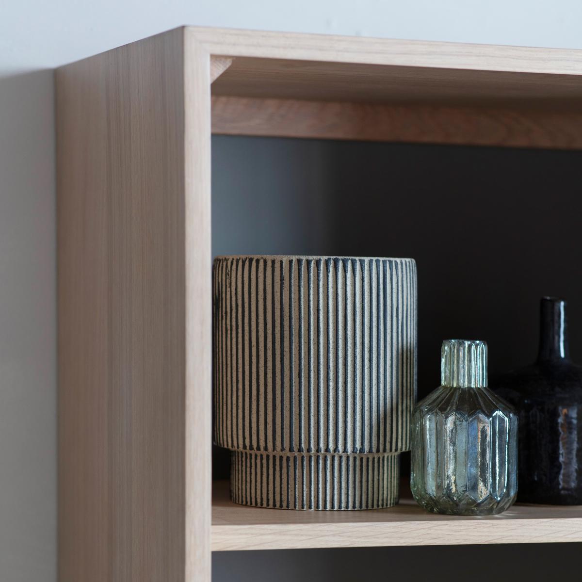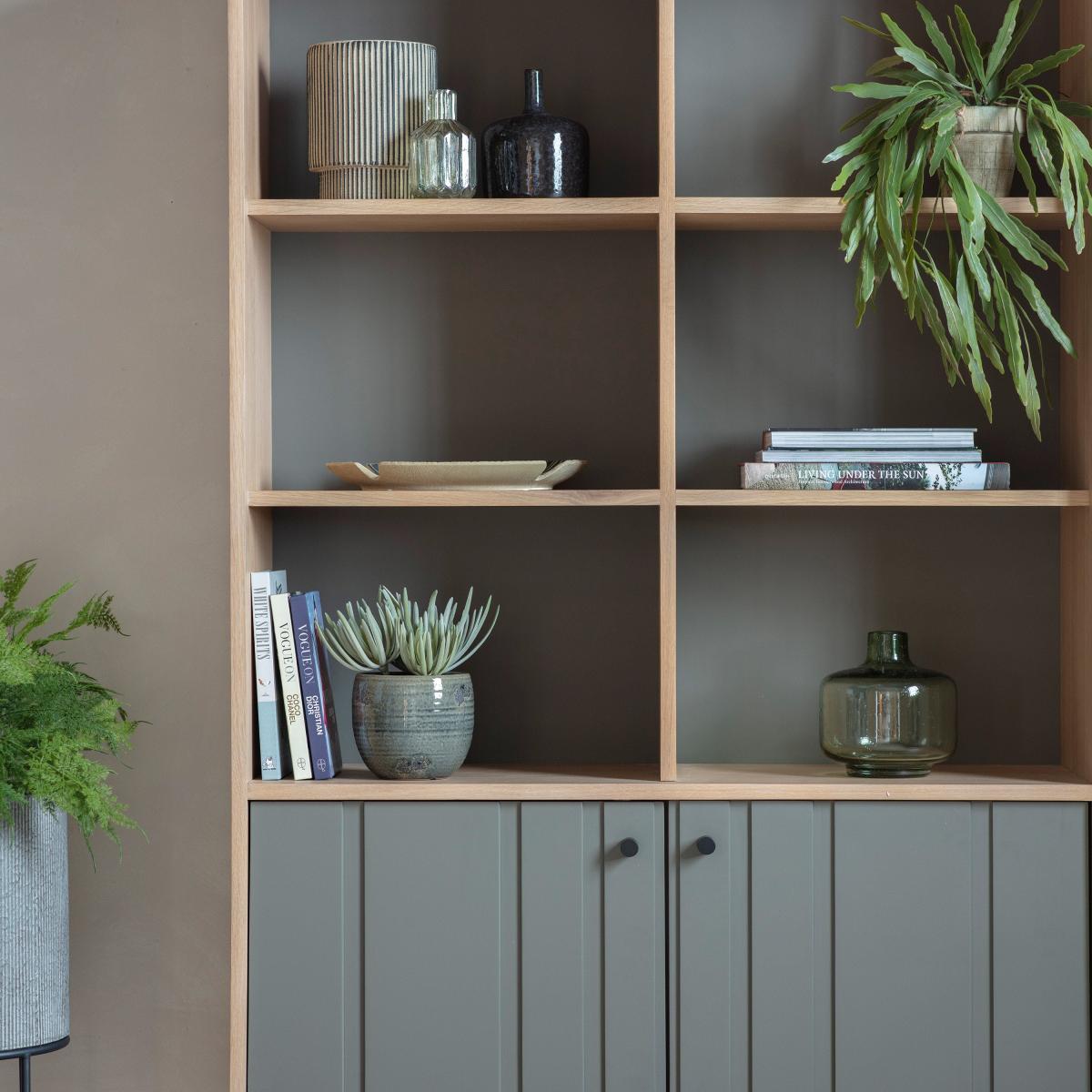 * The Flint furniture collection features a fusion of Japanese minimalism and Scandi style* Natural oak has been paired with mid-grey painted, with routing to create a relief design adding detail to the doors* Features six open shelves, with mid-grey painted panels* Slim black metal legs* Matching handles complete the stylish design The Flint furniture collection features a fusion of Japanese minimalism and Scandi style to create these beautiful contemporary Japandi design pieces. Natural oak has been paired with mid-grey painted, with routing to create a relief design adding detail to the doors. The Flint Open Display features six open shelves, with mid-grey painted panels behind to match the cupboard doors. Slim black metal legs and matching handles complete the stylish design.