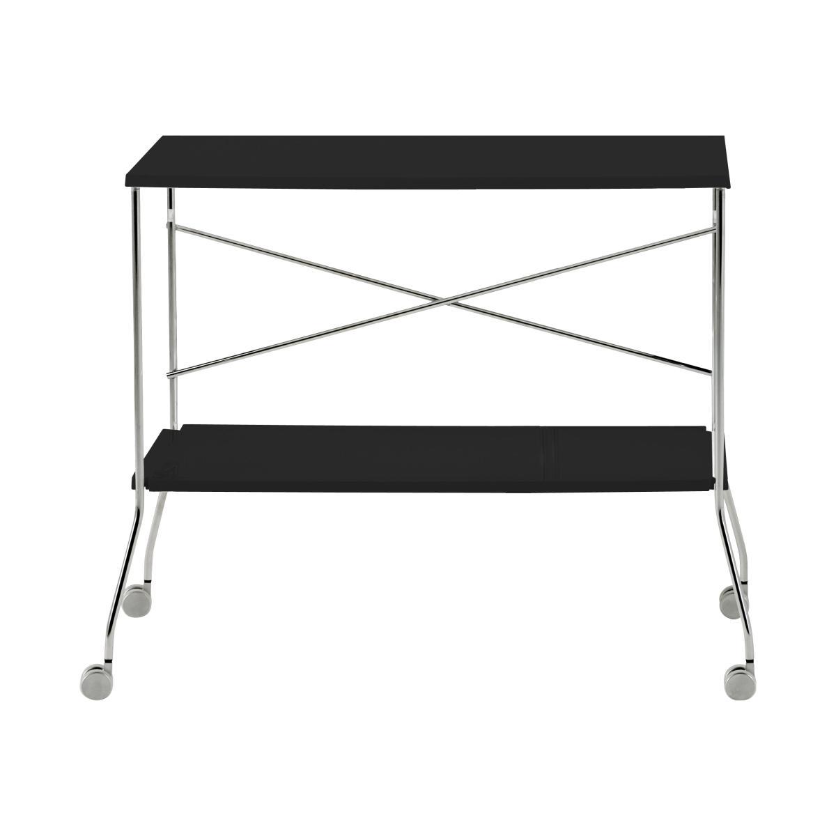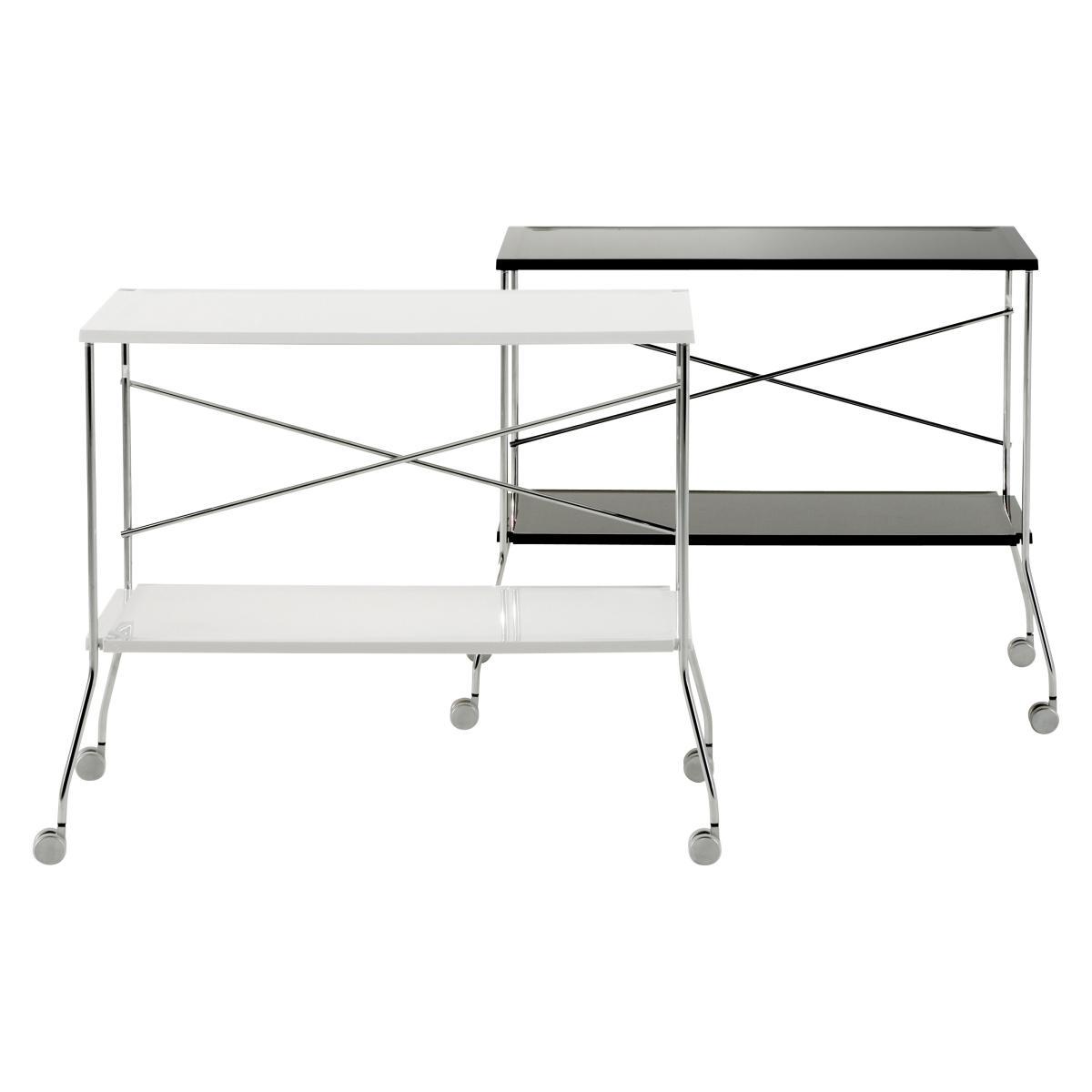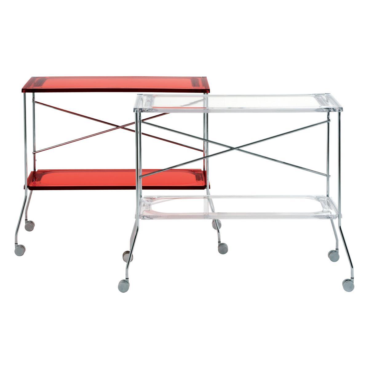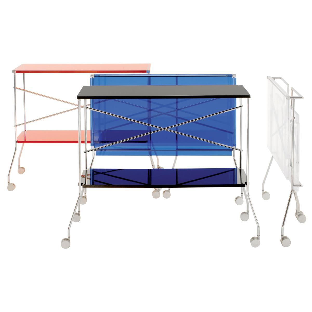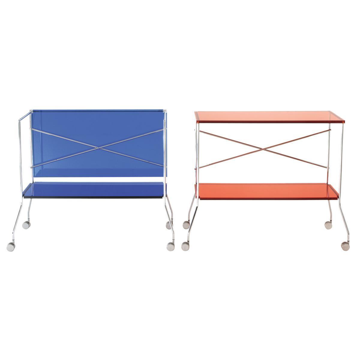 A new folding trolley joins the Kartell collection: Flip, which successfully combines plastic trays with a metal frame. The trays are made from PMMA lenticular sheet, constituting the utmost expression of practicality and sophisticated design. Flip can be used as a trolley, ideal for aperitifs and buffets, but also as a handy coffee table (the trays are independent). When folded up it occupies a very small space, making it easy to store.