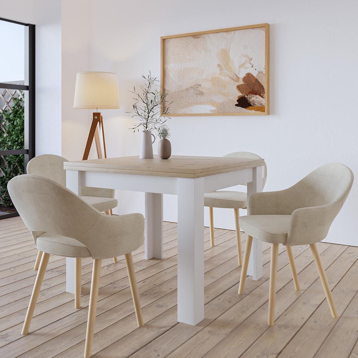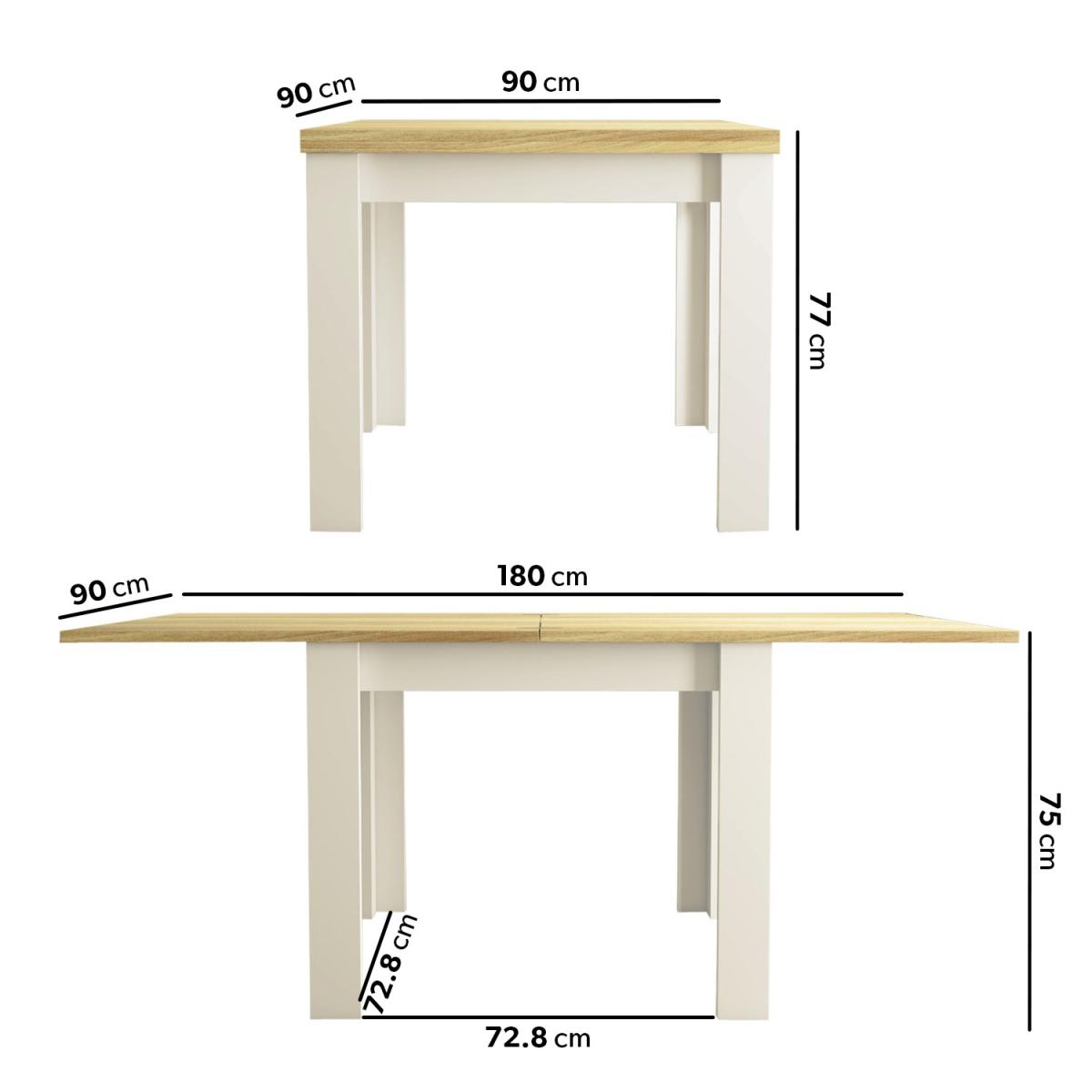 This bundle includes: Flip Top Cream/Oak Dining Table - New Town 4 Beige Fabric Dining Chairs with Oak Legs - Colbie Features we love Cream and oak extendable dining table 4 beige chenille upholstered dining chairs Great for hosting 4 dinner guests Ideal space-saving dining set for smaller rooms Perfect for a neutral dining or kitchen space Need to know Dining Table Information Dimensions: H77 x W90(closed)/W180(extended) x D90 cm Size: Seats 6 (4 chairs included in set) Material:Wood combination Finish: Painted cream & oak effect Assembly required: Yes Range: New Town Dining Chair Information Number of chairs: 4 Dimensions:H79 x W57 x D58 cm Material: Chenille fabric Finish:Beige textured chenille fabric with sleek oak legs Assembly required: Yes Range: Colbie