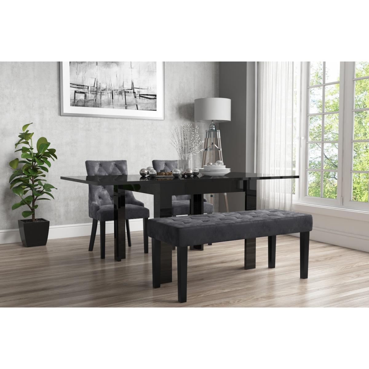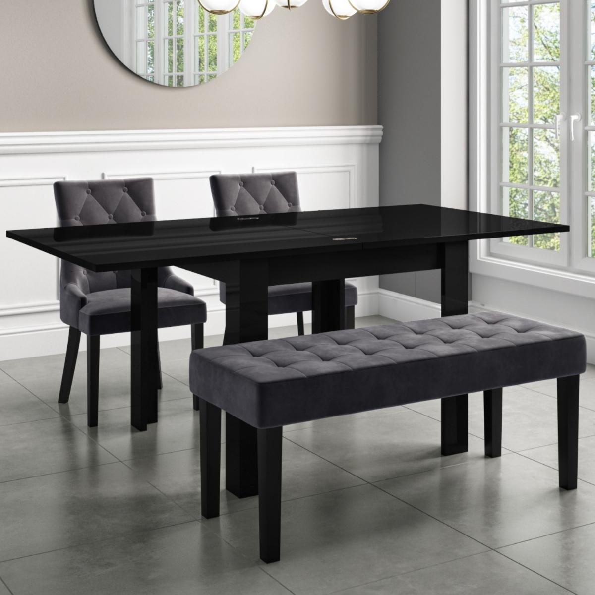 . This bundle includes. Vivienne Flip Top Black High Gloss Dining Table. 2 x Kaylee Dining Chairs in Grey Velvet with Black Legs. 1 x Kaylee Luxury Dining Bench Charcoal Grey with Black Legs Features we love Black gloss dining table with flip top mechanism Ideal for 4 diners when closed; 6 when extended. Comes with 2 grey velvet chairs and 1 velvet bench. All chairs are foam-filled for comfort and support. Table folds when not in use perfect for smaller homes Need to know. Dining Table Information. Dimensions. H77 x W90 x D90 cm(closed) H77 x W180 x D90 cm(open) Seats. 6 Colour. White Finish. High gloss Material. Wood combination Assembly required. Yes Dining Chair Information. Number of chairs. 2 Dimensions. H92 x W56 x D64cm Floor to seat. 49cm Finish. Luxe charcoal grey velvet and; smooth black legs Material. Solid rubberwood and velvet Assembly required. Yes Range. Kaylee. Dining Bench Information. Number of benches. 1 Dimensions. H48.5 x W117 x D44cm Seats. 2 Finish. Charcoal grey velvet and; smooth black legs Material. Solid rubberwood and velvet Assembly required. Yes..