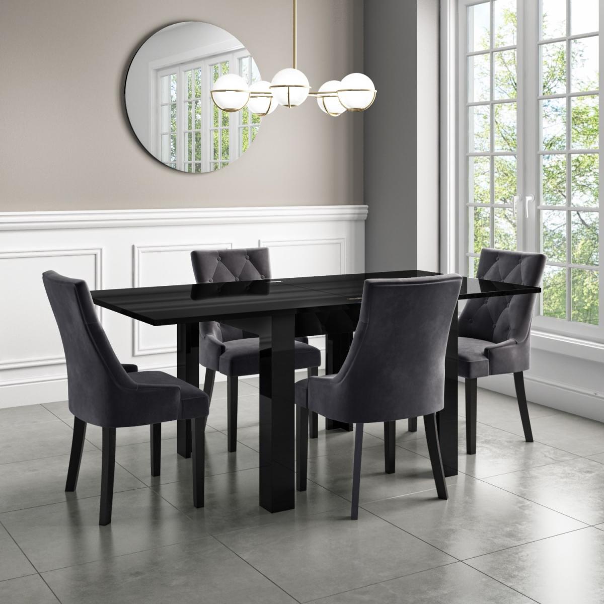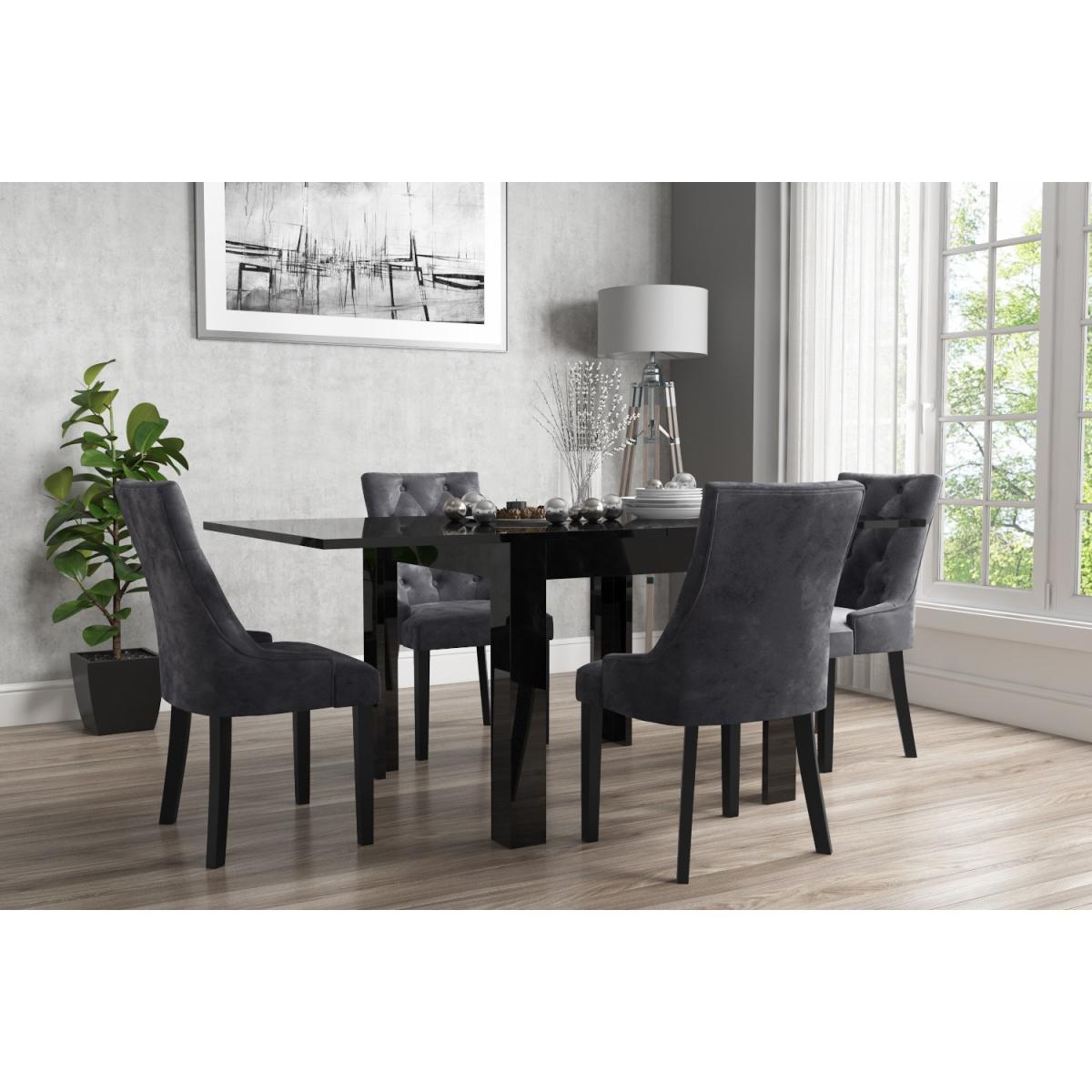 Black gloss dining table with flip top mechanism Ideal for 4 diners when closed; 6 when extended Comes with 4 grey velvet chairs All chairs are foam-filled for comfort and support Table folds when not in use, perfect for smaller homes Need to know Dining Table Information Seats:6 Colour:White Finish:High gloss Material:Wood combination Assembly required:Yes Dining Chair Information Number of chairs:4 Floor to seat:49cm Finish:Luxe charcoal grey velvet & smooth black legs Material: Solid rubberwood and velvet Assembly required:Yes Range Kaylee