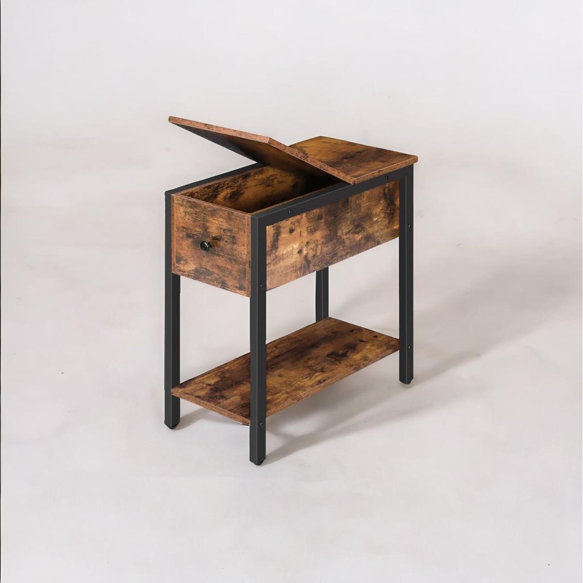 The matte black metal frame exudes an industrial charm, complemented by the rustic brown wooden board that introduces a touch of retro style. This side table combines these elements to create a visually striking piece that doubles as a home decor item. This side table is highly adaptable. It can be positioned beside your living room couch or serve as a practical bedside table. Even in small apartments or compact rooms, it fits perfectly, providing a designated spot for your lamp or potted plants. Featuring a hidden hinge, the coffee table's top can be flipped up to reveal a concealed compartment, making it an ideal space to store personal items like wallets, keys, and documents. This side table boasts two shelves that offer versatile storage. You can adorn the top shelf with decorations while utilizing the second shelf to keep books and magazines within easy reach. While multifunctional furniture often involves complex assembly, this piece from Rafaelo Mobilia is the exception. We've streamlined each step, ensuring that you can complete the setup quickly and easily by following the detailed instructions included in the package.