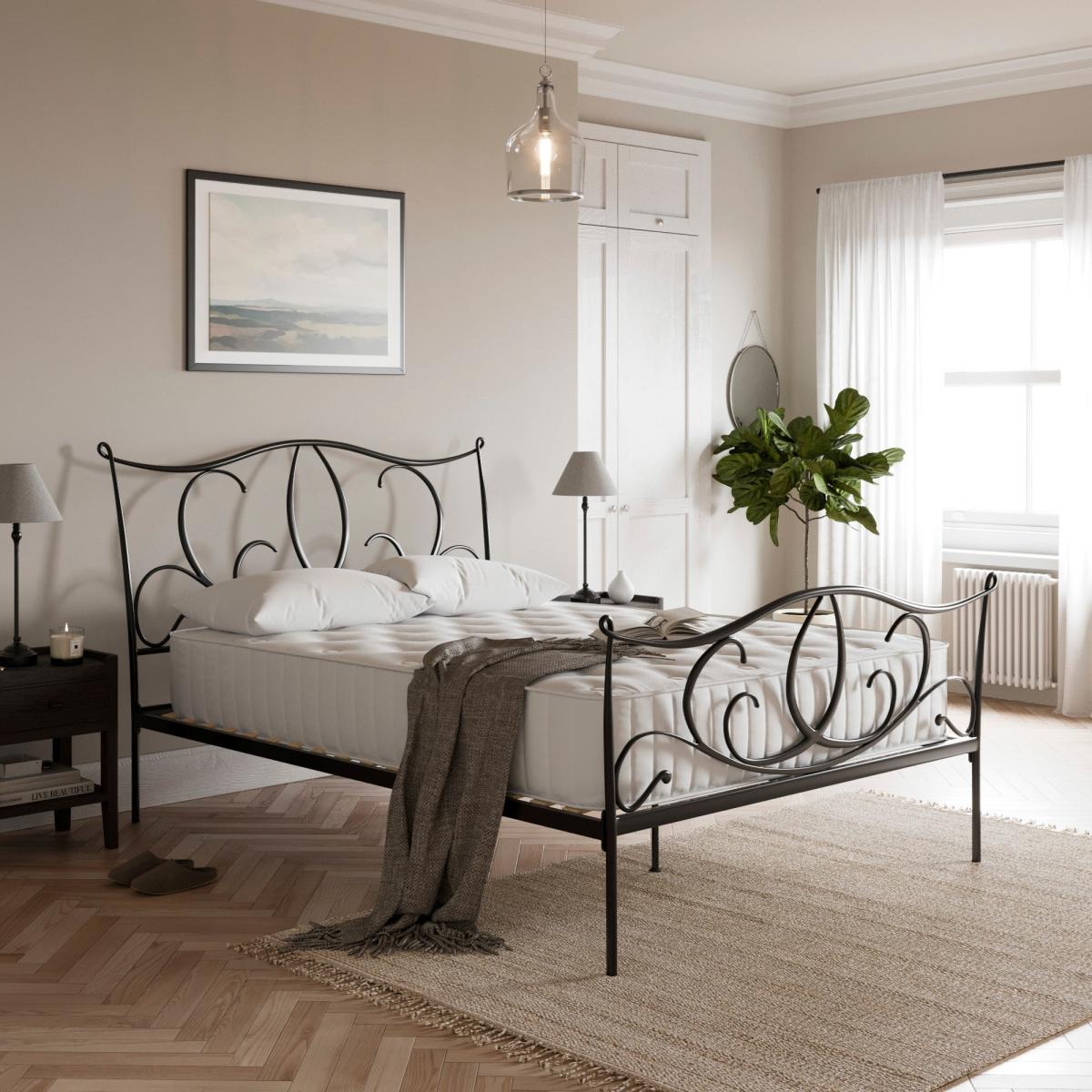 I’m a fan of the Flo bed for its clean, open metalwork and low-profile silhouette - it brings a touch of structure without feeling heavy. It sits equally well in a pared-back Scandi scheme or a more traditional bedroom, and its matt-black finish can ground softer colour palettes or complement industrial accents. For a quick refresh, layer neutral linens with a textured throw and scatter cushions in muted tones. Add matching black-metal side tables or a woven rug beneath to define the space, and hang a simple pendant or wall lamp above each side for balanced, practical lighting.