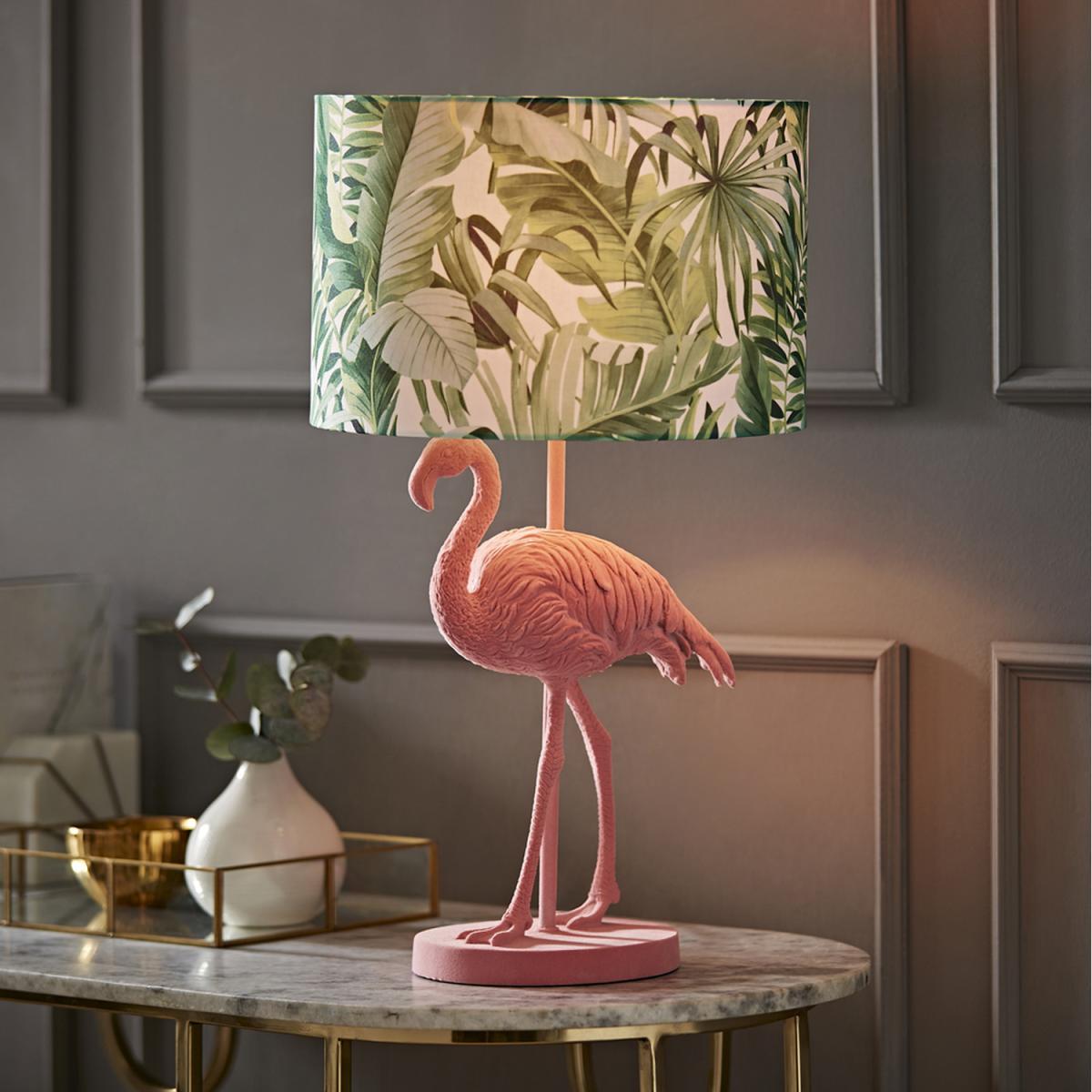 Add some character and charm to your home with this flamingo table lamp. Complete in a pink velvet finish with a tropical palm tree lampshade, this lamp is sure to be a showstopper that'll brighten any room. The in-line rocker switch provides convenient control, making it easy to illuminate your space. This table lamp is a unique piece of lighting that will add a touch of personality and style, transforming your room in seconds.