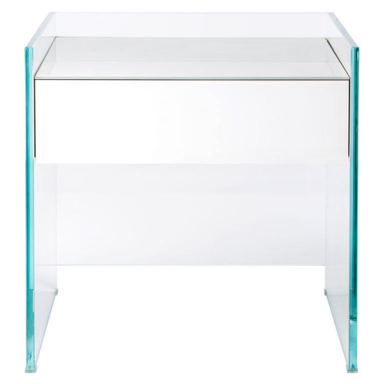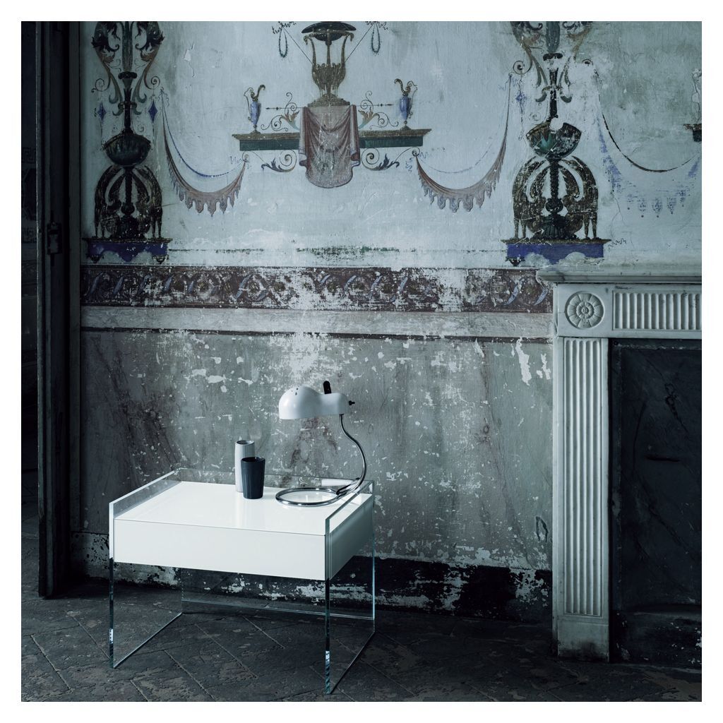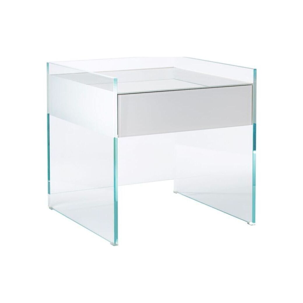 Designed by Patrick Norguet, the white Float Bedside Table is part of a contemporary furniture collection by Glas Italia. Exquisitely crafted using thick transparent glass, the bedside table is finished with a sleek white push-to-open drawer. Crafted from wenge wood topped in tempered glass finished with a white gloss lacquer, the drawer lends a refined touch to the elegant console. The attention to detail in this minimalist design continues to the interior, where the bottom of the drawer is lined in glass in the same finish as the exterior. A contemporary interpretation of a classic design, this Float Bedside Table would enhance any home with its modern aesthetic.