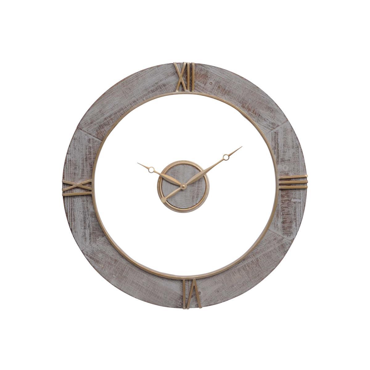 Design. A contemporary piece with traditional influence, the Floating Wall Clock boasts a unique two-piece design that is sure to enhance any wall space. The central circle of the clock features two hands and is fixed independently of the outer ring, which is detailed with four roman numeral signifiers. The grey distressed finish of the wooden frame provides an antique effect, beautifully complemented by its metallic copper accents. Large enough to make a statement yet light in its structure, the Floating Wall Clock will be the focus of the room wherever it is placed.