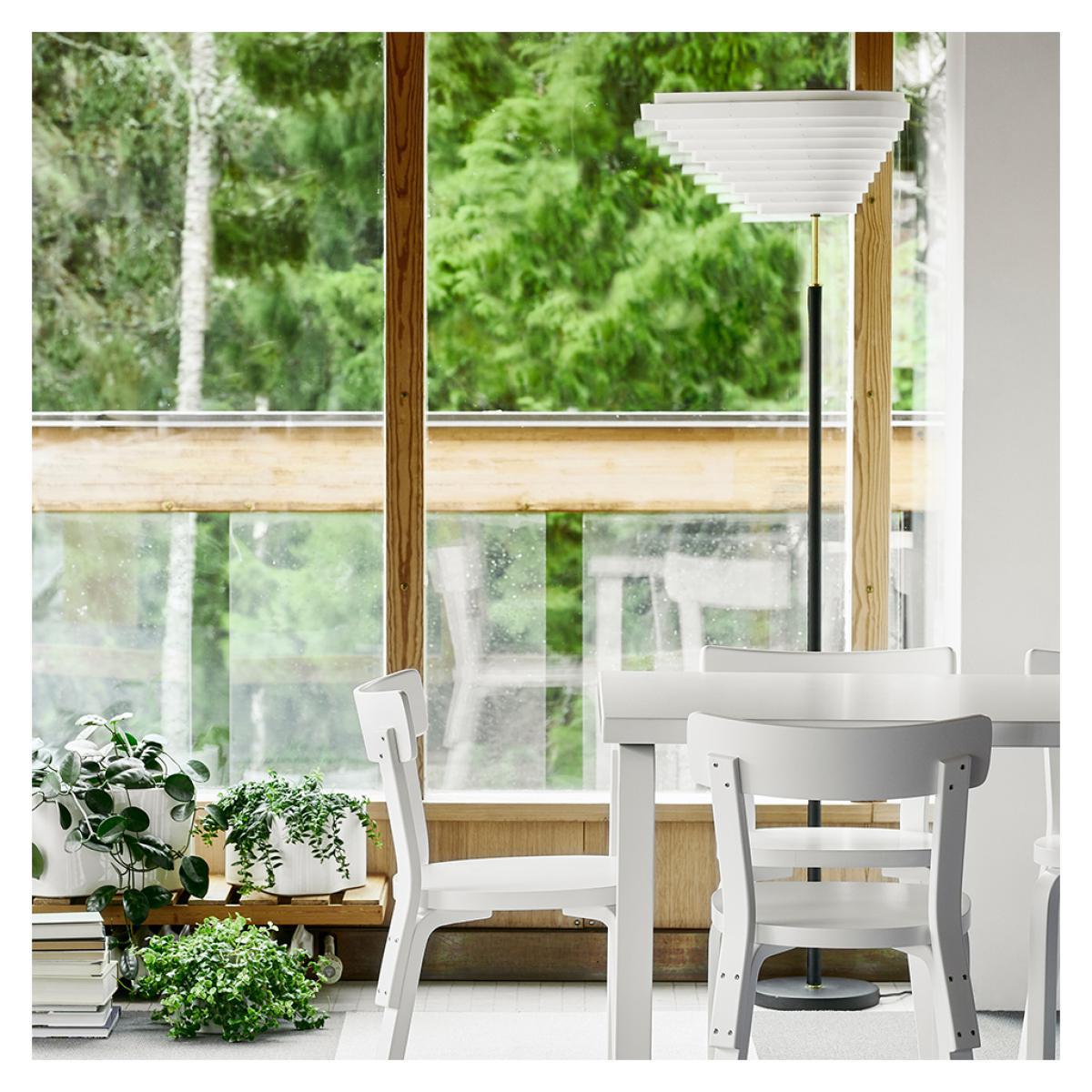 Originally designed in 1954 by Alvar Aalto for the National Pensions Institute in Helsinki, the brass Floor Lamp A805 would lend a touch of contemporary style to any home. Nicknamed the 'Angel Wing' owing to its asymmetrical shape, the floor light features a hand-riveted shade crafted from delicate, lacquered metal strips. A striking combination of lines and curves, the shade offers an even diffusion of light that prevents glare. Accented with a polished brass collar and an elegant black leather stand finished by hand in Finland, this sophisticated floor lamp would enhance any space with its warm glow. Alvar Aalto was one of the founding members of Finnish manufacturer, Artek, and embraced strong individuality with focus on designing predominantly for humanity, creating functional and dynamic pieces for public and personal spaces alike. Requires: 1 x Max 60W E27 bulb (not included)