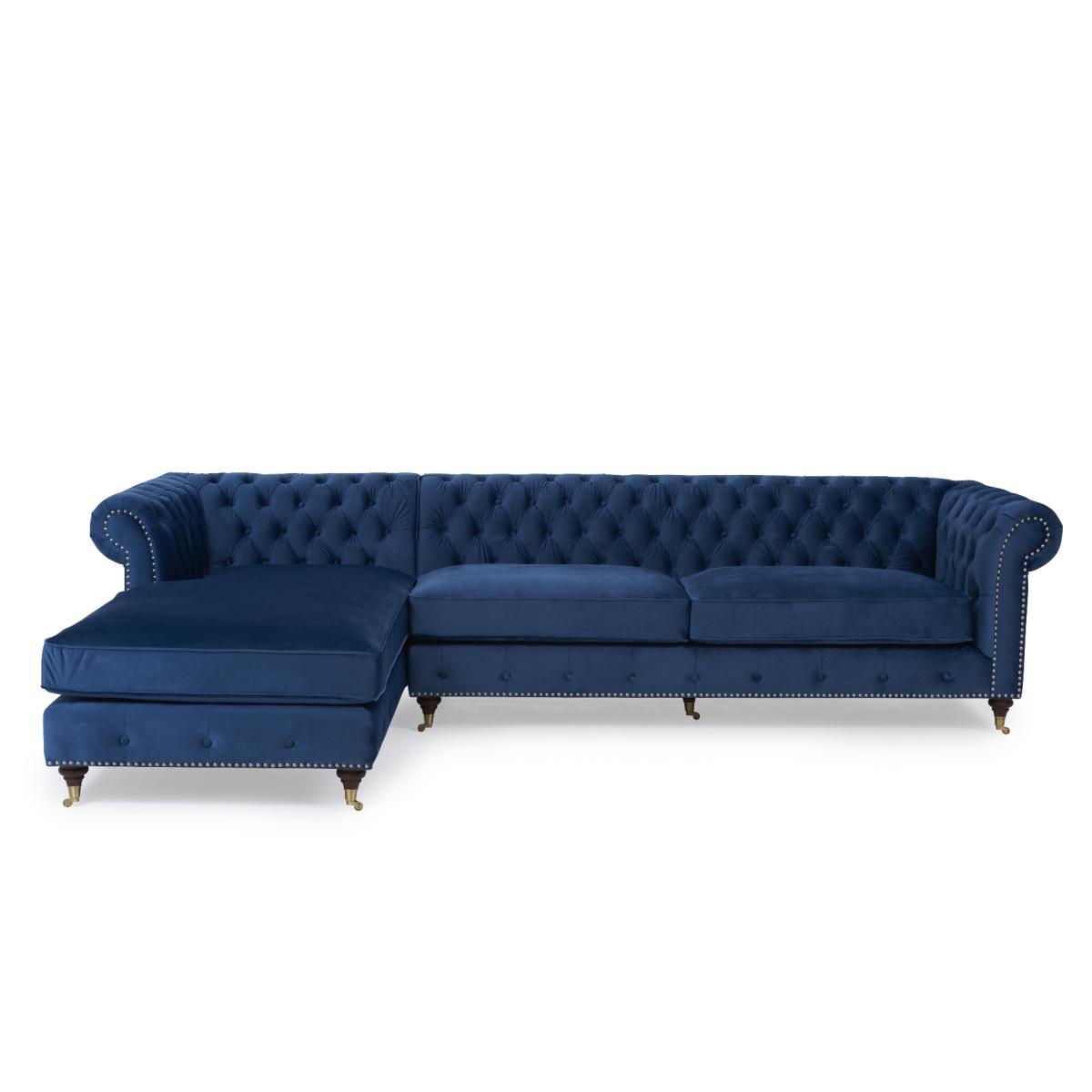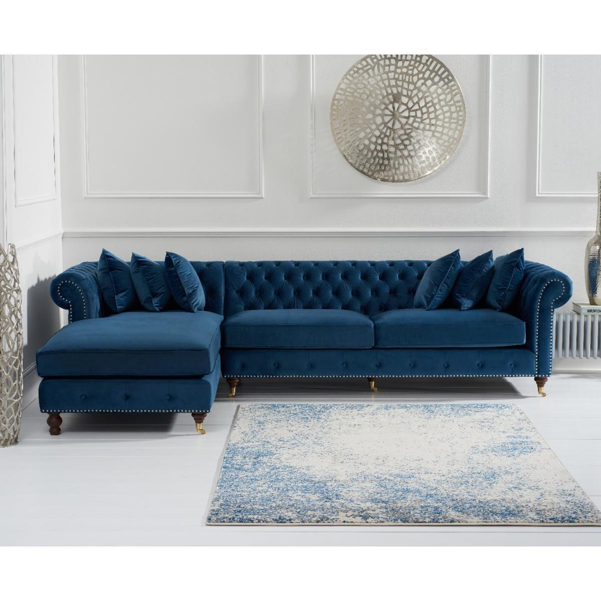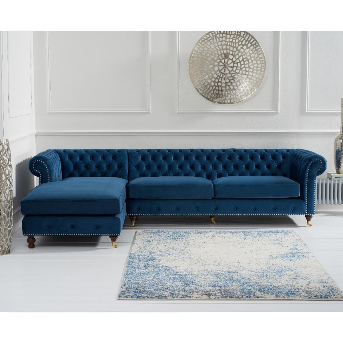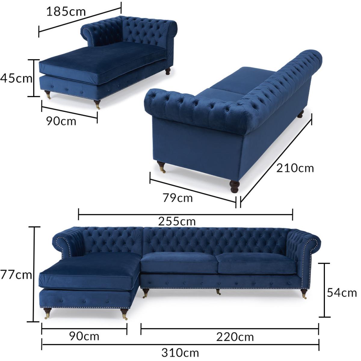 The Flora Blue Velvet Left Facing Chesterfield Chaise Sofa is the ultimate in eye-catching style and comfortable design. The striking sofa is upholstered in smooth, rich blue velvet for an on-trend look that leaves a lasting impression. Featuring a stunning deep-buttoned design, the chaise sofa boasts elegantly scrolled armrests complemented by chic metal stud detailing. As comfortable as it is unmistakably stylish, the left facing chaise sofa features foam-filled seat cushions and comes complete with 6 free scatter cushions. Also available in a Right Facing Option Measurements: Sofa: W: 305cm D: 90cm Chaise: W: 182cm H: 45cm Chaise Cushion: W: 153cm H: 15cm Inner Sofa: W: 255cm Armrest: W: 20cm