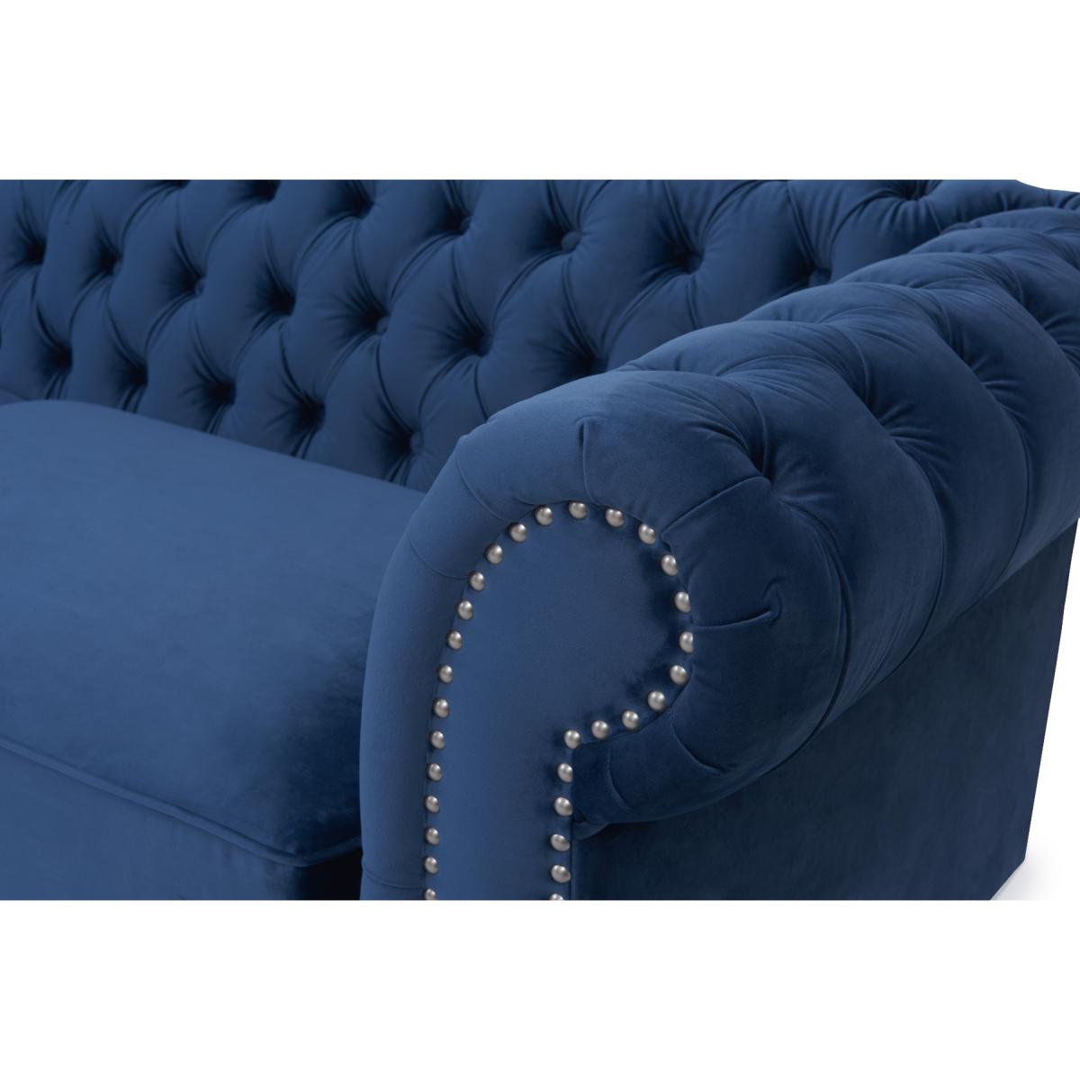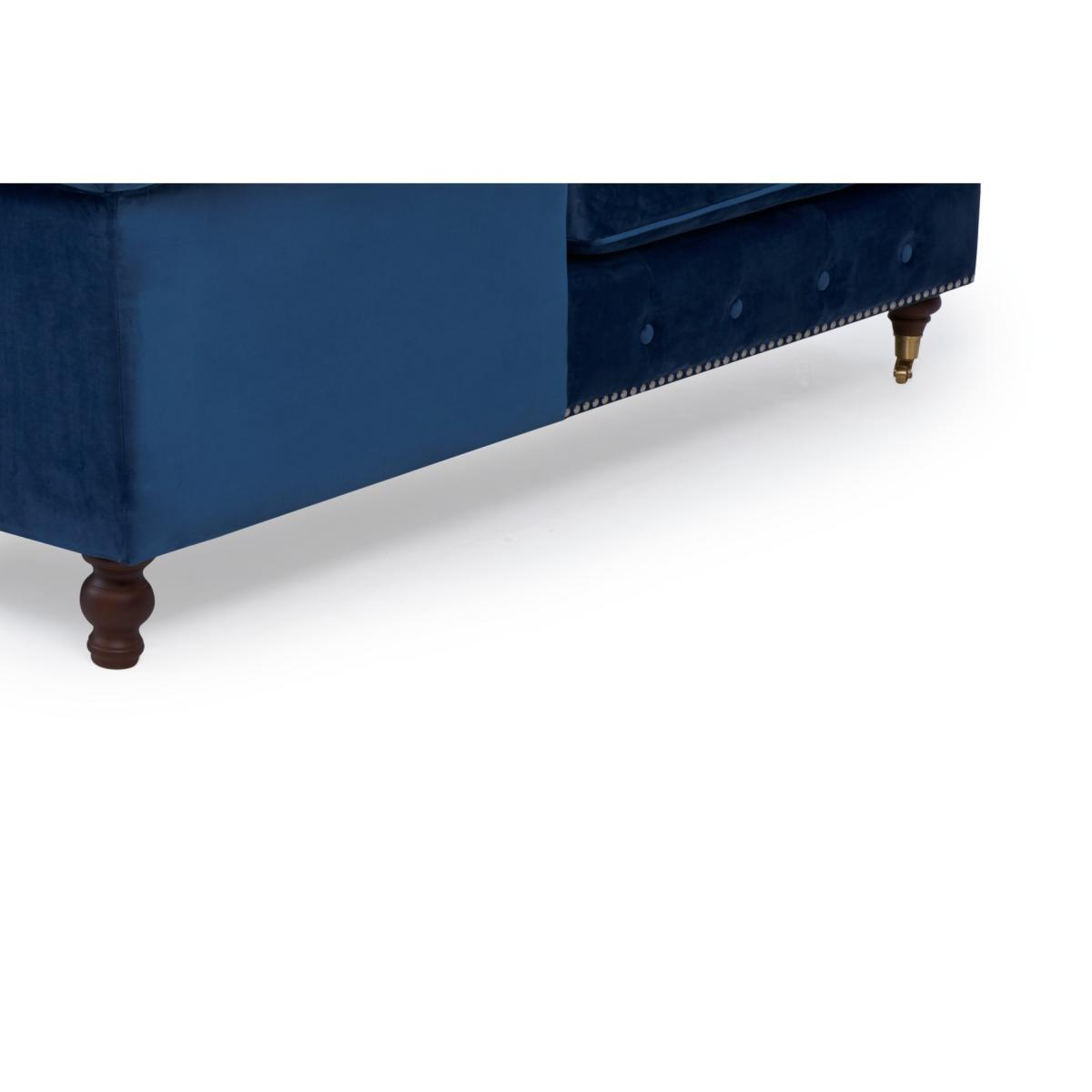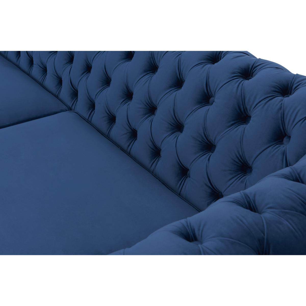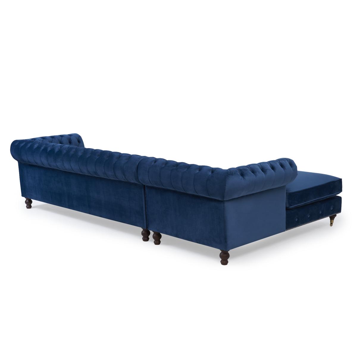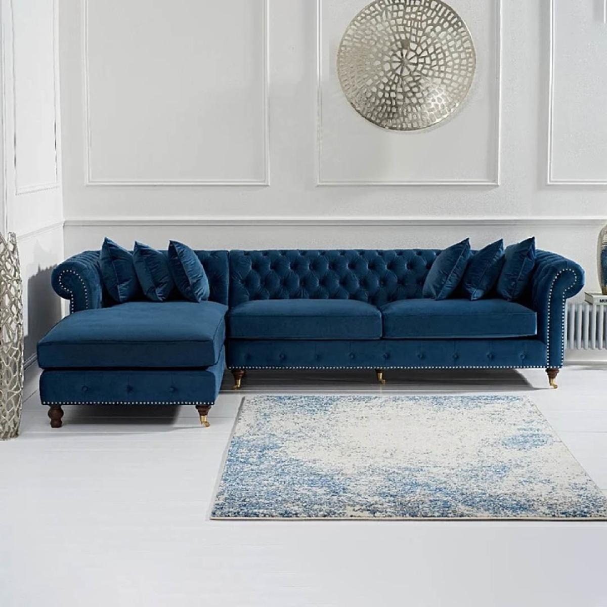 The Flora Blue Velvet Left Facing Chesterfield Chaise Sofa is the ultimate in eye-catching style and comfortable design. The striking sofa is upholstered in smooth, rich blue velvet for an on-trend look that leaves a lasting impression. Featuring a stunning deep-buttoned design, the chaise sofa boasts elegantly scrolled armrests complemented by chic metal stud detailing. As comfortable as it is unmistakably stylish, the left facing chaise sofa features foam-filled seat cushions and comes complete with 6 free scatter cushions. Also available in a Right Facing Option Measurements: Sofa: W: 305cm D: 90cm Chaise: W: 182cm H: 45cm Chaise Cushion: W: 153cm H: 15cm Inner Sofa: W: 255cm Armrest: W: 20cm