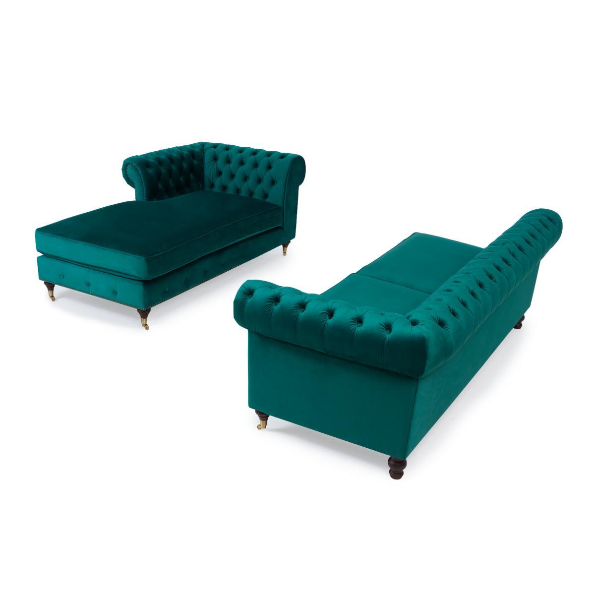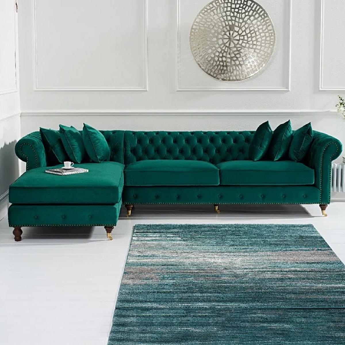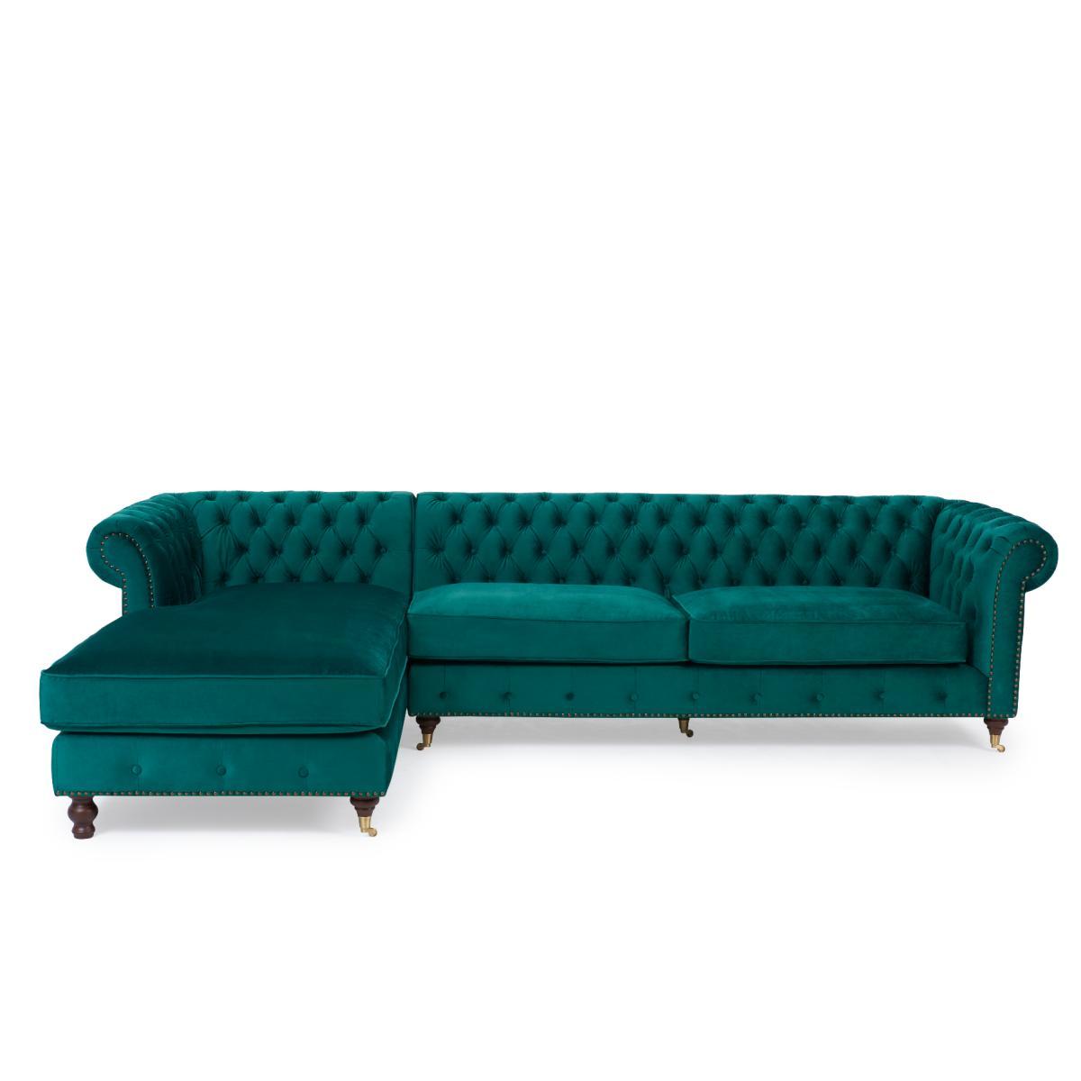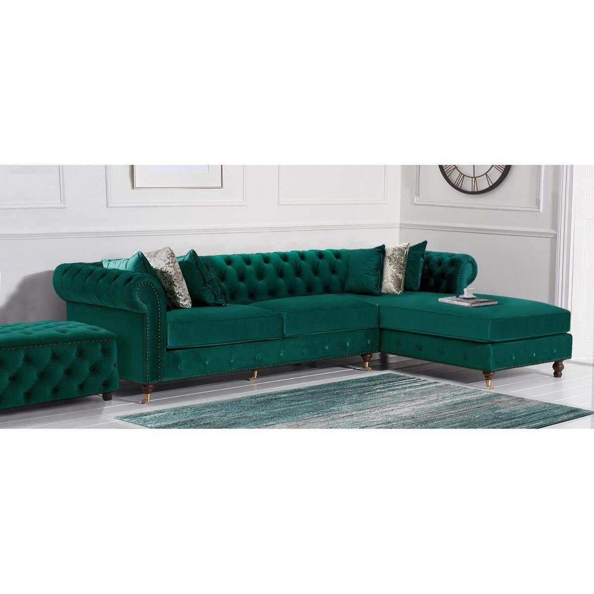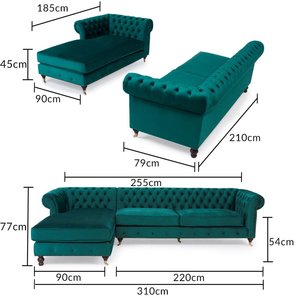 The Flora Green Velvet Left Facing Chesterfield Chaise Sofa features a striking design to make a stunning impression in any living room. Chic and comfortable, the chaise sofa is upholstered in smooth velvet in rich green and features an attractive Chesterfield inspired tufted-button design. Boasting stylish scrolled armrests complemented by metal stud detailing, the chaise sofa is a beautiful addition to your home. 6 free scatter cushions complete the look. Also available in a Right Facing Option Measurements: Sofa: W: 305cm D: 90cm Chaise: W: 182cm H: 45cm Chaise Cushion: W: 153cm H: 15cm Inner Sofa: W: 255cm Armrest: W: 20cm