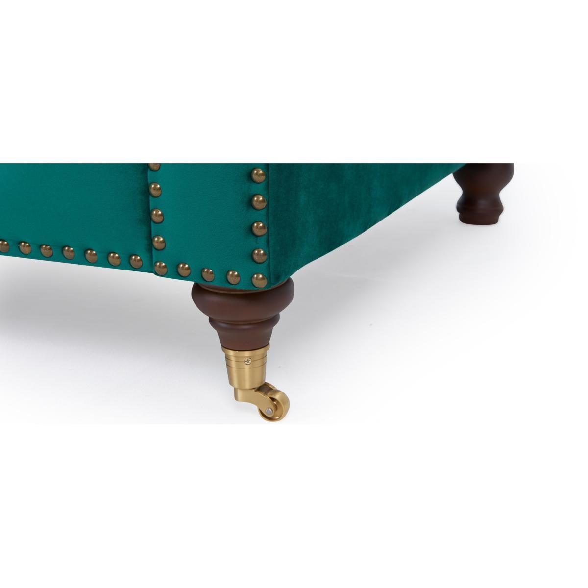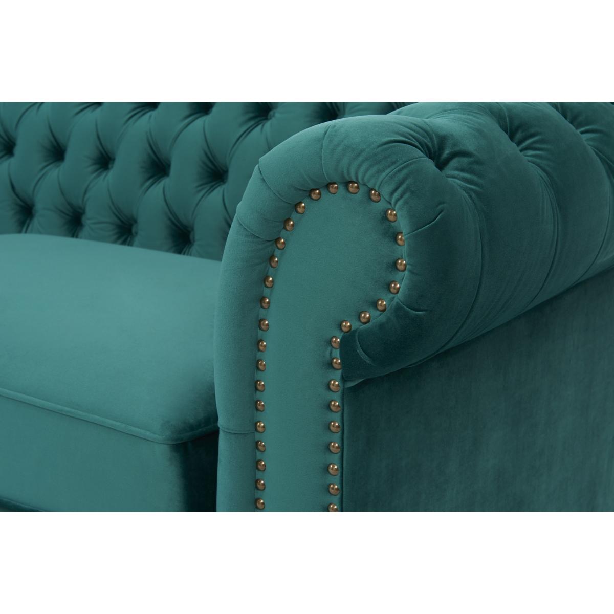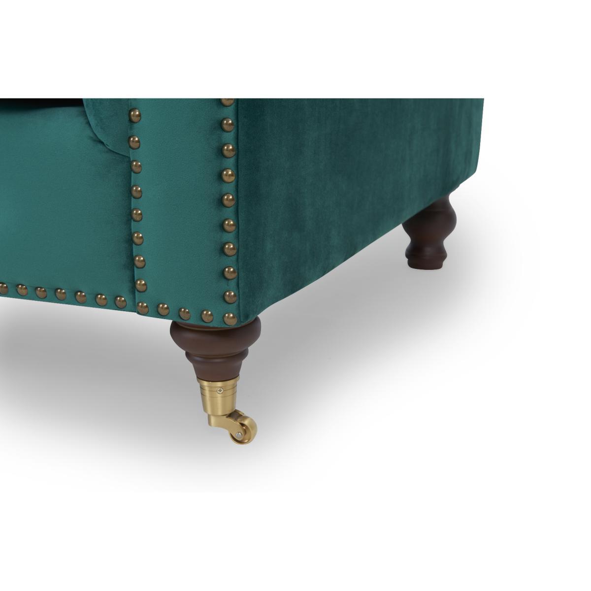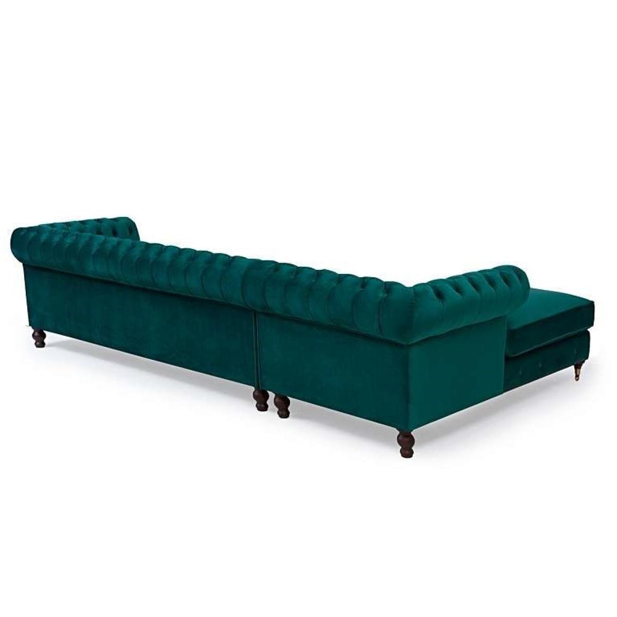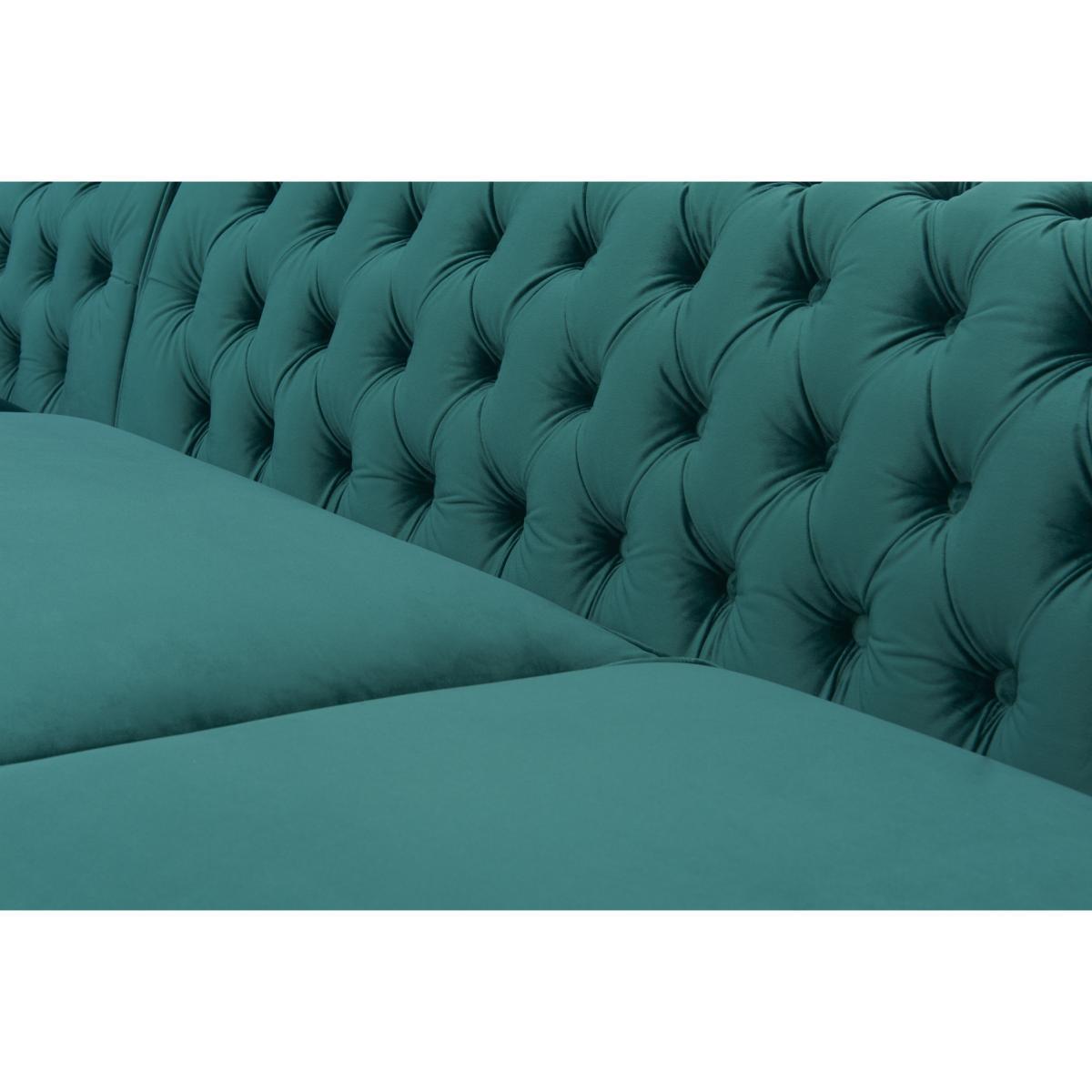 The Flora Green Velvet Left Facing Chesterfield Chaise Sofa features a striking design to make a stunning impression in any living room. Chic and comfortable, the chaise sofa is upholstered in smooth velvet in rich green and features an attractive Chesterfield inspired tufted-button design. Boasting stylish scrolled armrests complemented by metal stud detailing, the chaise sofa is a beautiful addition to your home. 6 free scatter cushions complete the look. Also available in a Right Facing Option Measurements: Sofa: W: 305cm D: 90cm Chaise: W: 182cm H: 45cm Chaise Cushion: W: 153cm H: 15cm Inner Sofa: W: 255cm Armrest: W: 20cm